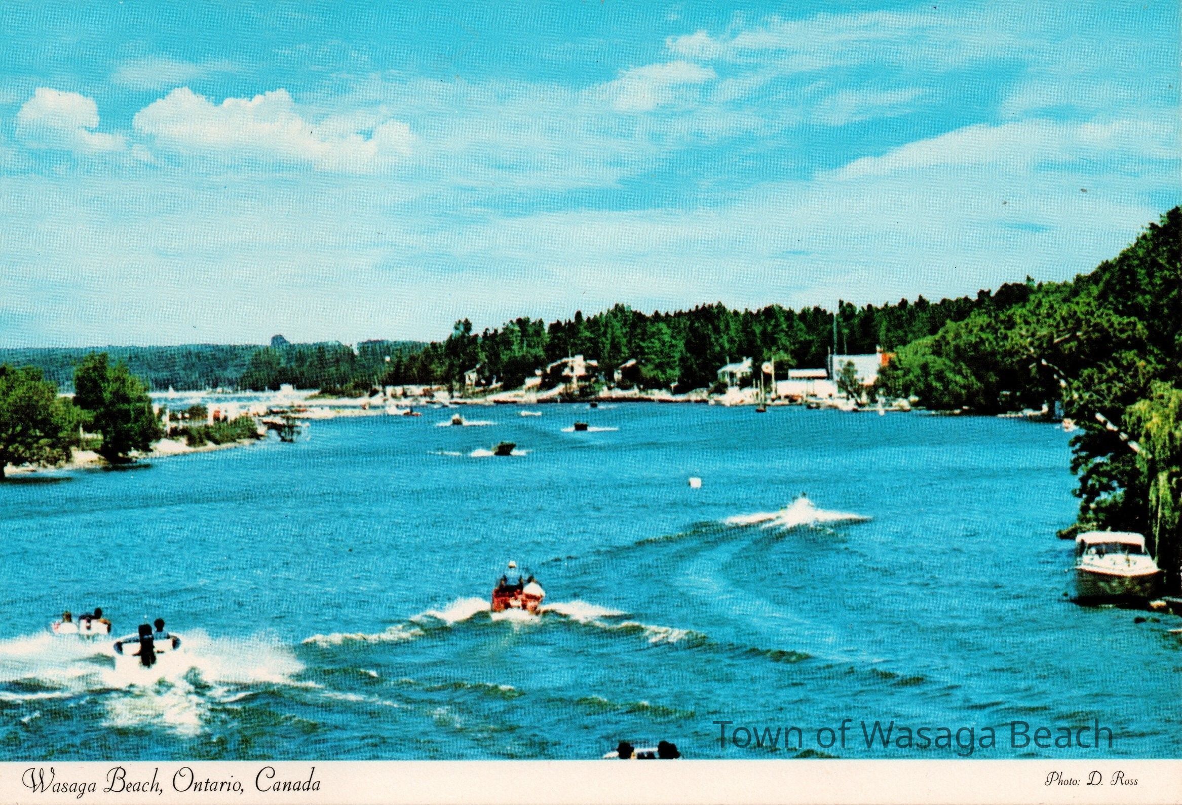 The postcard features a scene with several boats boating along the river in Wasaga Beach, Ontario, Canada by photographer, D. Ross.