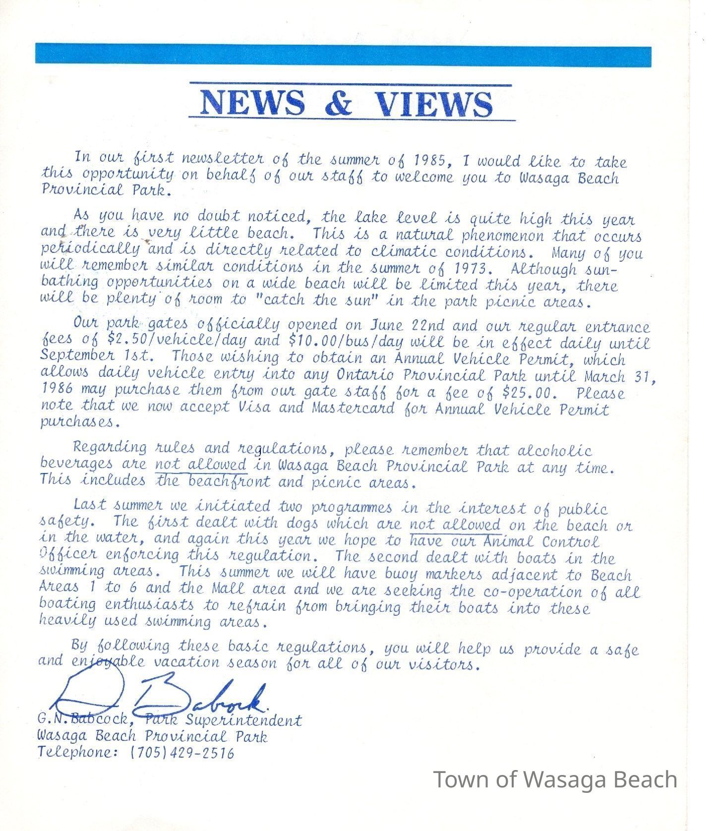 The newsletter, "Park News", discusses the higher water level noticeable by the narrower beach, recreation facilities, Interpretive sites, displays and information, park programs, park rates, annual vehicle permit, and park rules and regulations. The newsletter is signed by G. N. Babcock, Park Superintendent at the time.Acquisition