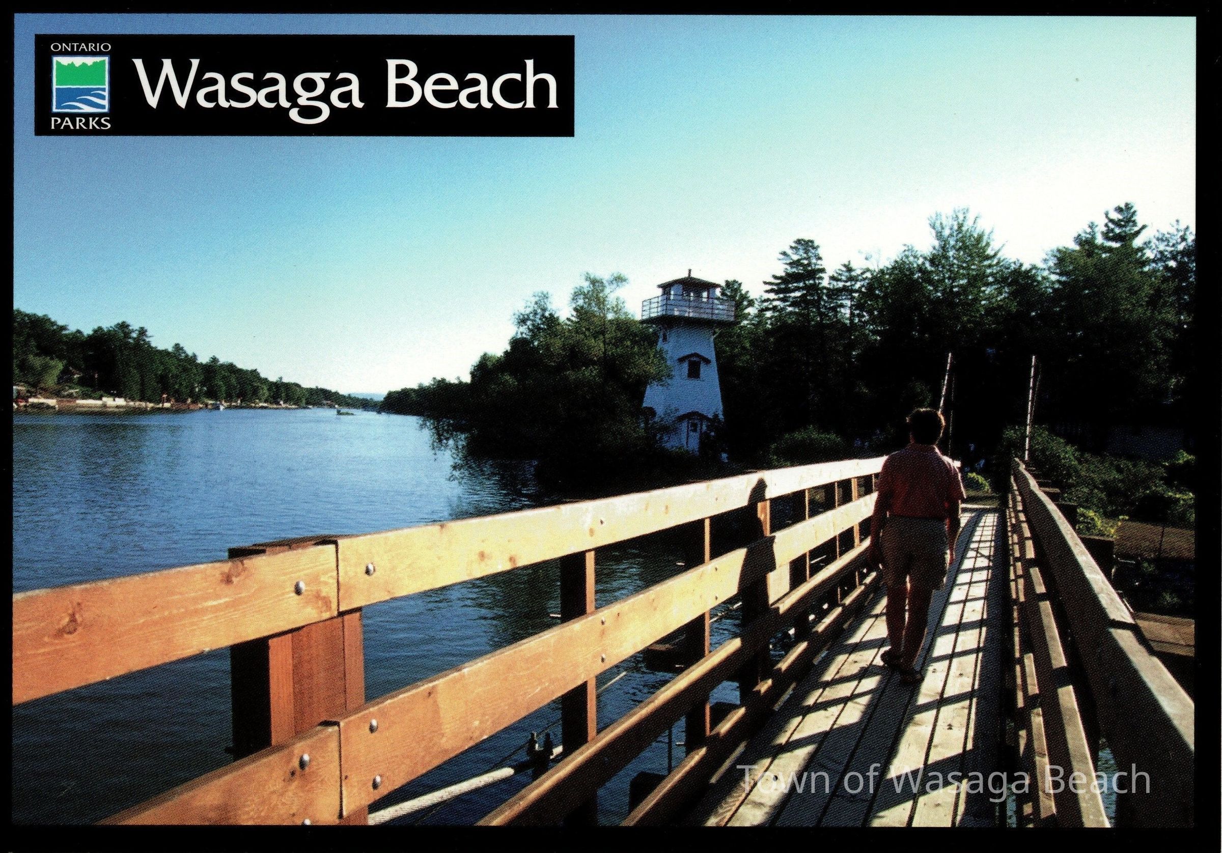 The photo, by Doug Hamilton, with the Ontario Parks logo, shows the bridge and lighthouse at Nancy Island Historic Site at Wasaga Beach with the Nottawasaga River in the background.