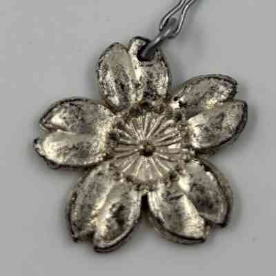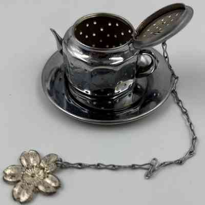 Mini metal Teapot shaped tea ball strainer/infuser with saucer and flower charm made in occupied JapanContext