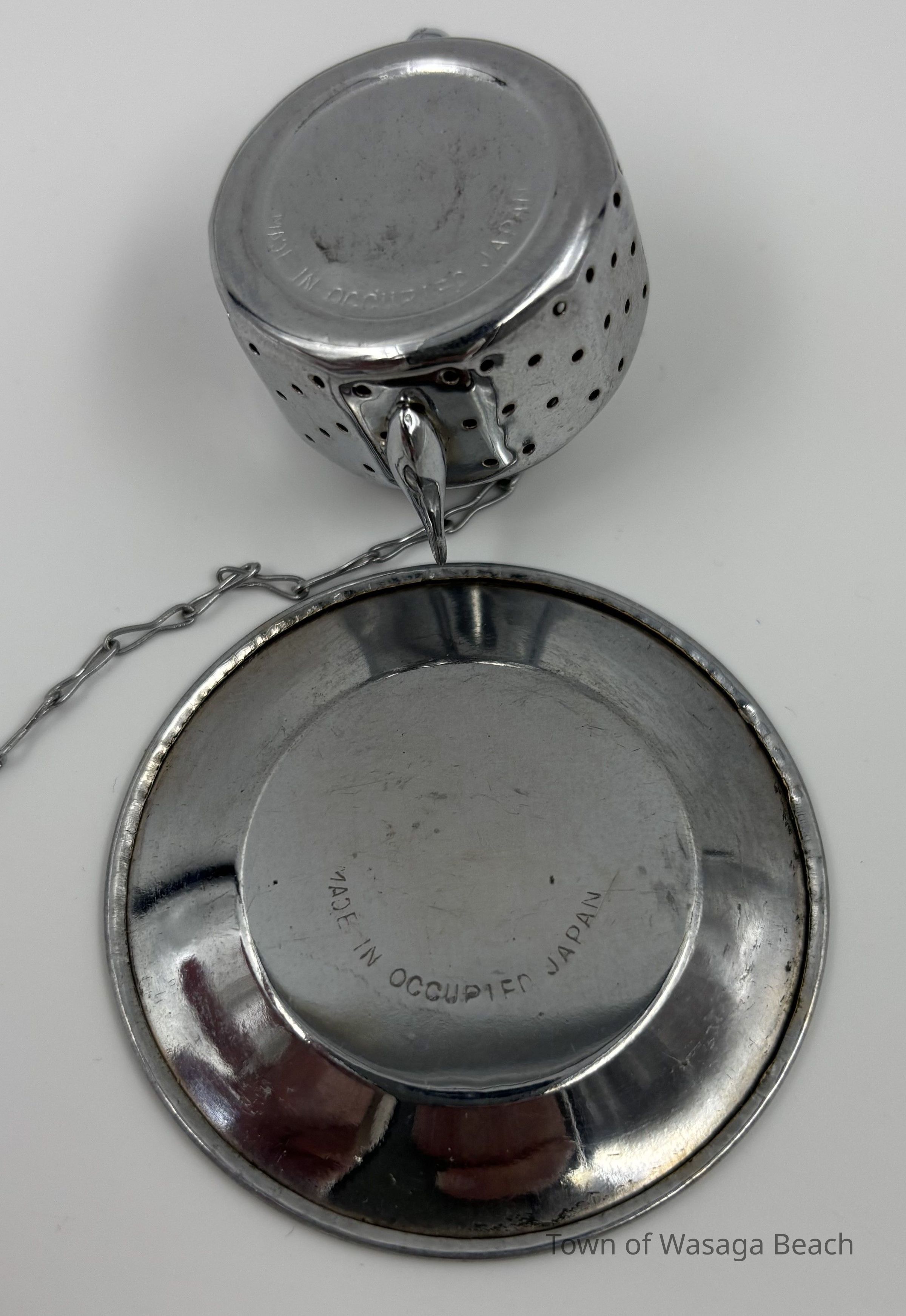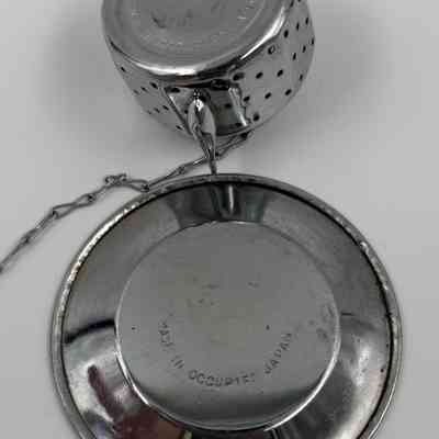 Vintage mini teapot shaped tea ball strainer/infuser with saucer and flower charm. The saucer is 2-1/8" diameter and has a partial label "Wasaga Beach Canada". The gold flower charm is approximately 3/4" wide. The teapot is approximately 1" high. The base of the teapot is 1-3/16" diameter. The teapot has a tiny spout and handle. The inside of the teapot shows signs of use when making tea. The bottom of the teapot and saucer are marked "MADE IN OCCUPIED JAPAN", a marking used between 1945 and 1952 when Japan was under US occupation, post WWII.Acquisition