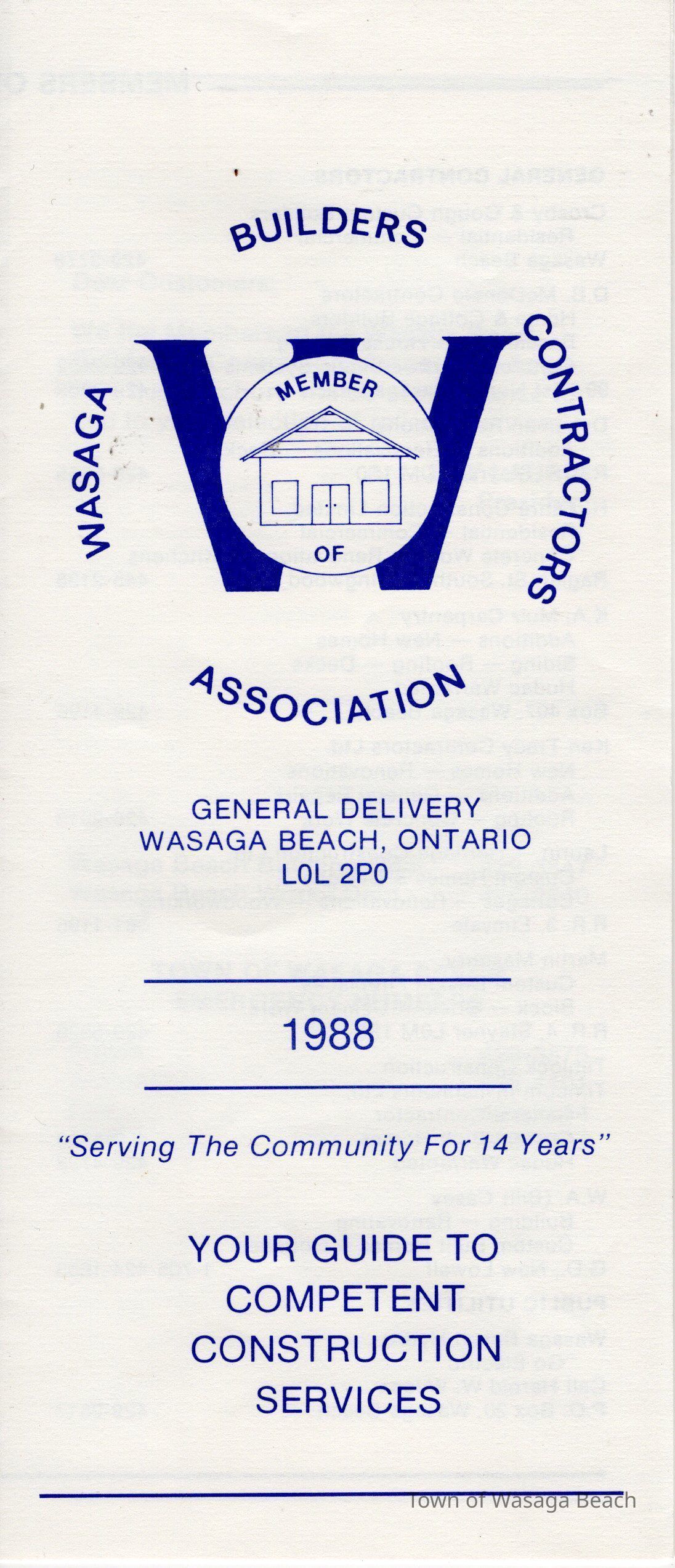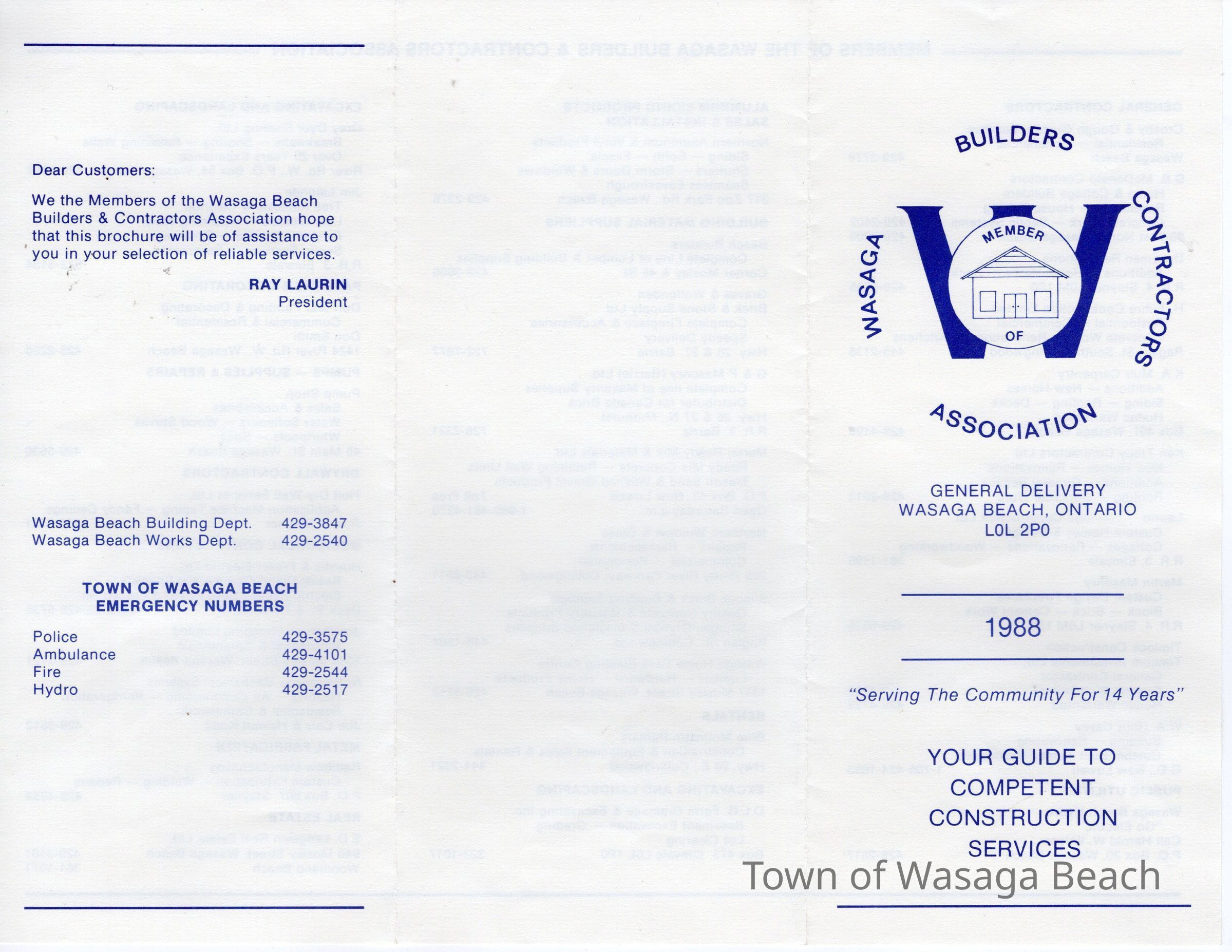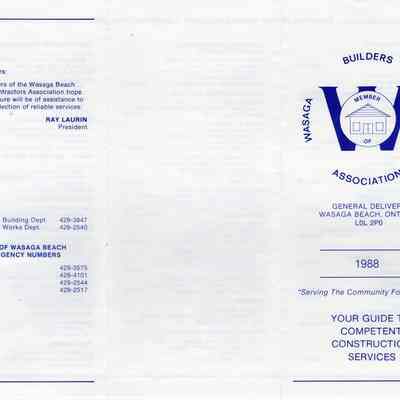 "Serving The Community For 14 Years" is printed on the front of the pamphlet along with the Association Logo, 1988 and "Your Guide to Competent Construction Service". Along with listing of various builders and contractors under General Contractors, Public Utilities, Aluminum Siding Products Sales & Installation, Building Material Supplies, Rentals, Excavating and Landscaping, Painting & Decorating, Pumps-Supplies & Repairs, Drywall Contractors, Mechanical Contractors, Metal Fabrication and Real Estate, a note from Ray Laurin, President is included with contact phone numbers for Wasaga Beach Building Dept., Wasaga Beach Works Dept., Police, Ambulance, Fire and Hydro.Acquisition