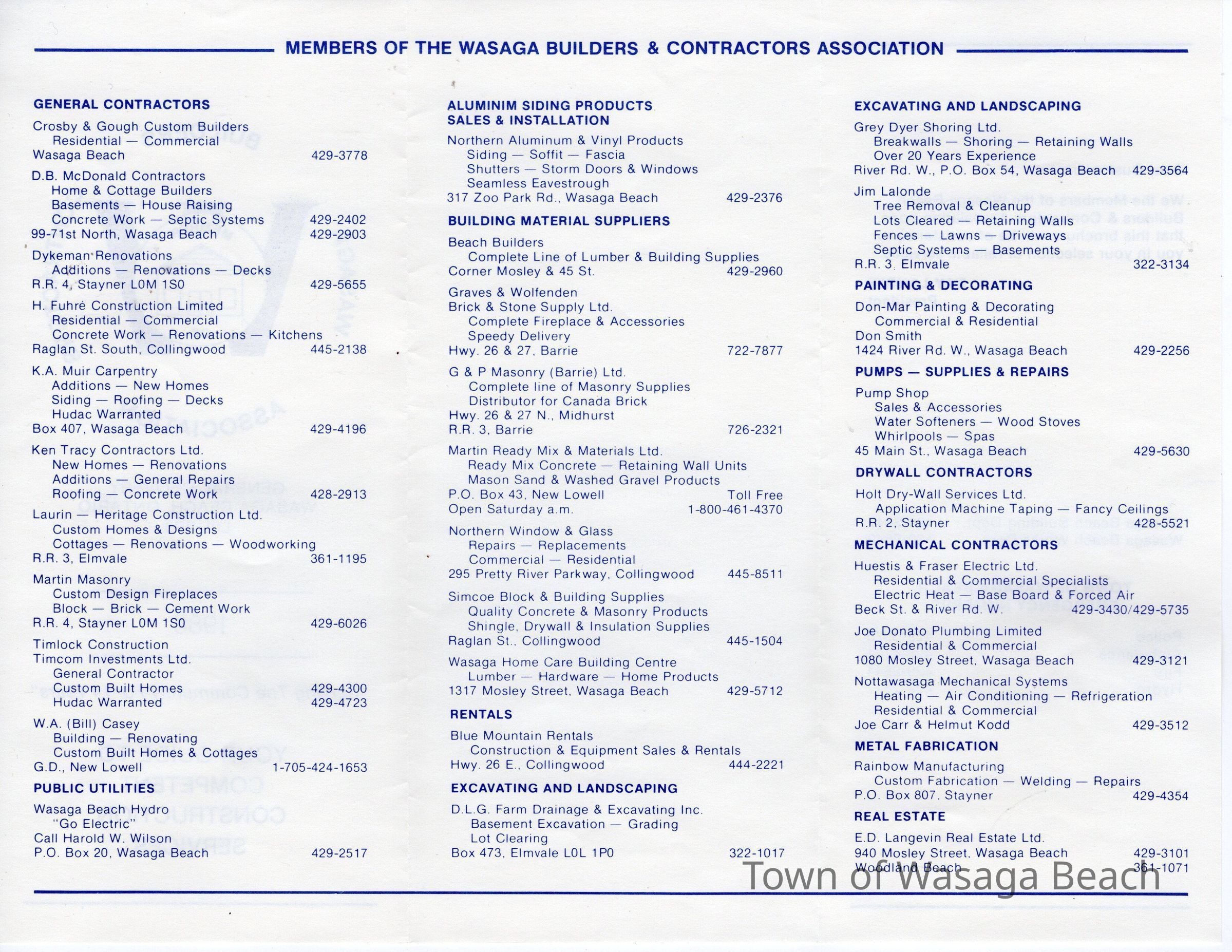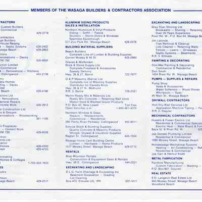 Pamphlet listing members of the Wasaga Builders & Contractors Association in 1988Context