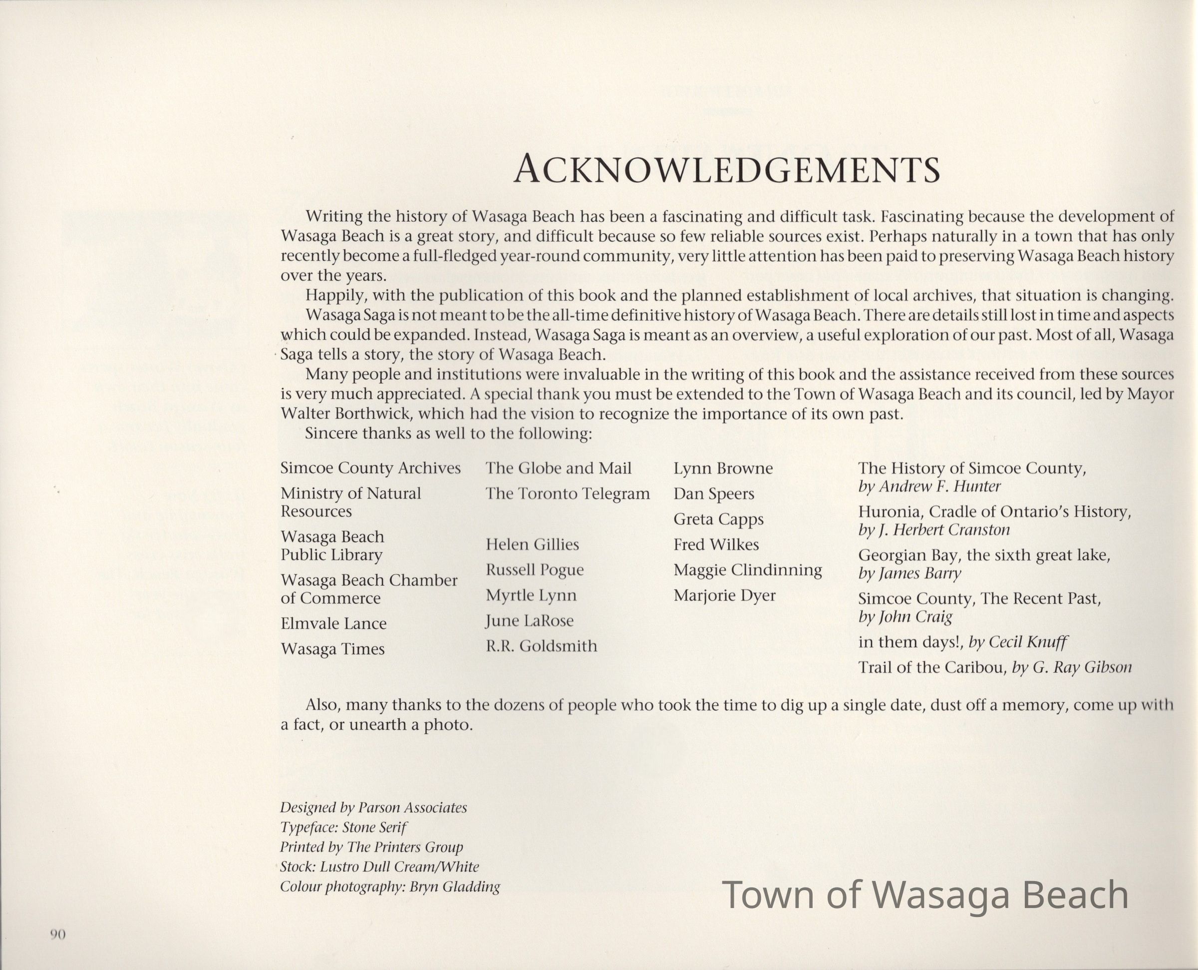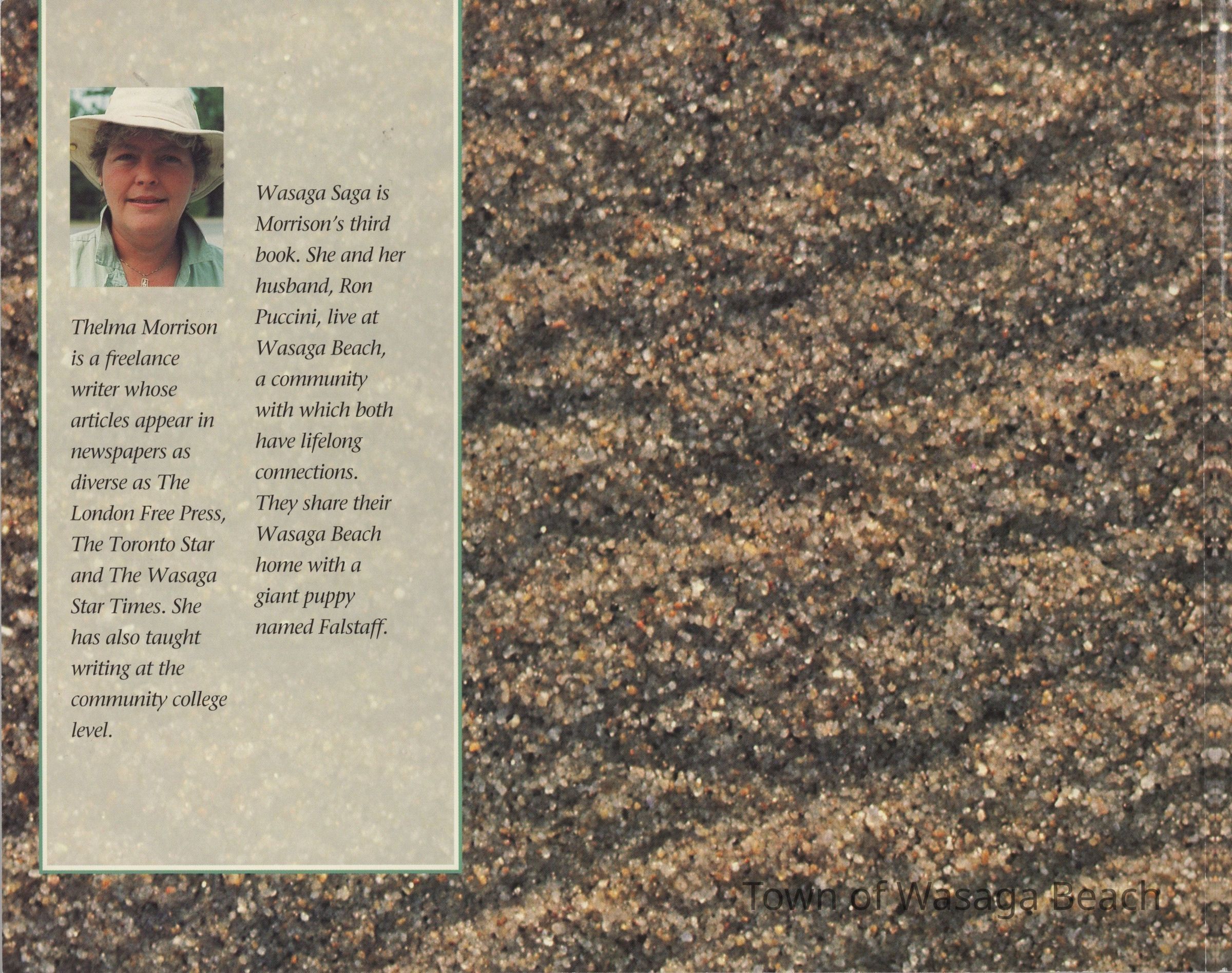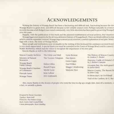 "Wasaga Saga, A History of Wasaga Beach", was written by Thelma Morrison in 1999 to commemorate the 25th Anniversary of the Incorporation of the Town of Wasaga Beach. The book, commissioned by the Town of Wasaga Beach, is 90 pages in total with a collection of 18 chapters that describe the history of Wasaga Beach from early years to incorporation to the Town's 25th Anniversary.Acquisition