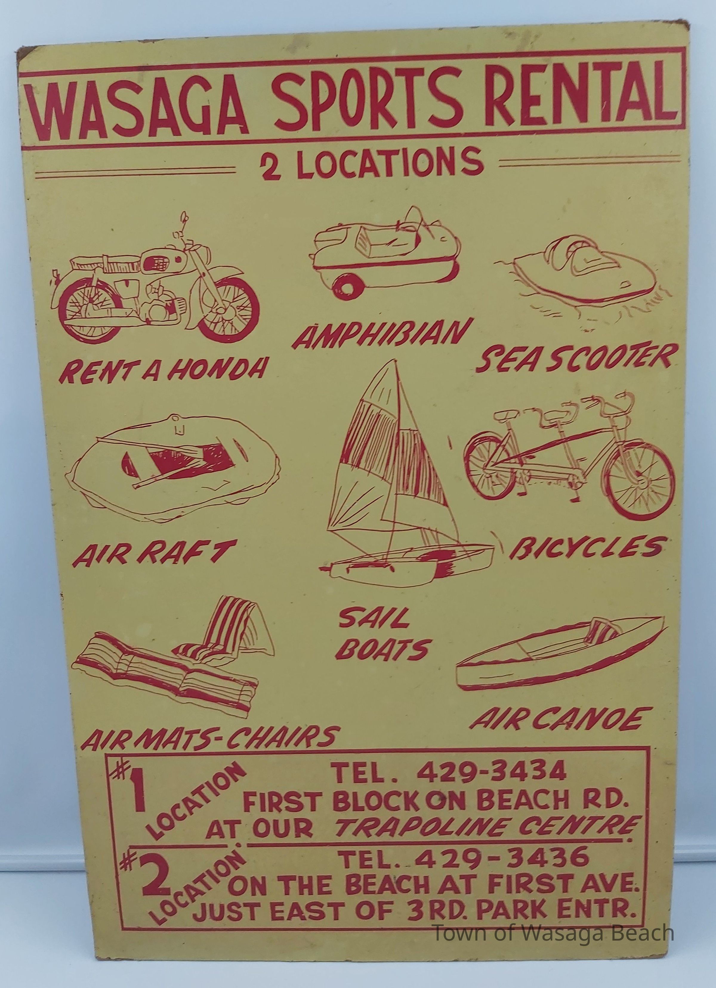 Wasaga Sports Rental operated two locations, 61 - 63 Beach Drive where visitors could rent a Honda motorcycle, amphibian, sea scooter, air raft, sail boat, bicycle, air mats-chairs and air canoe.Acquisition