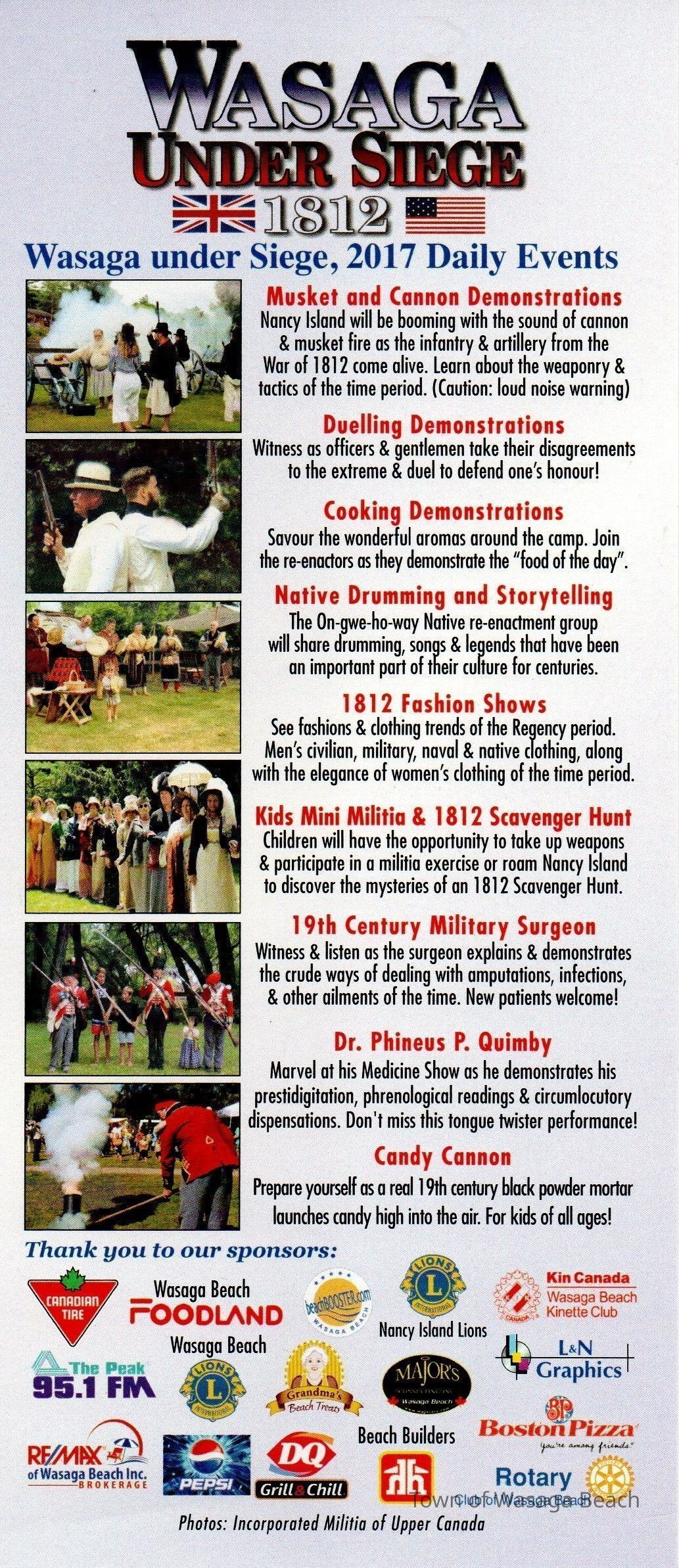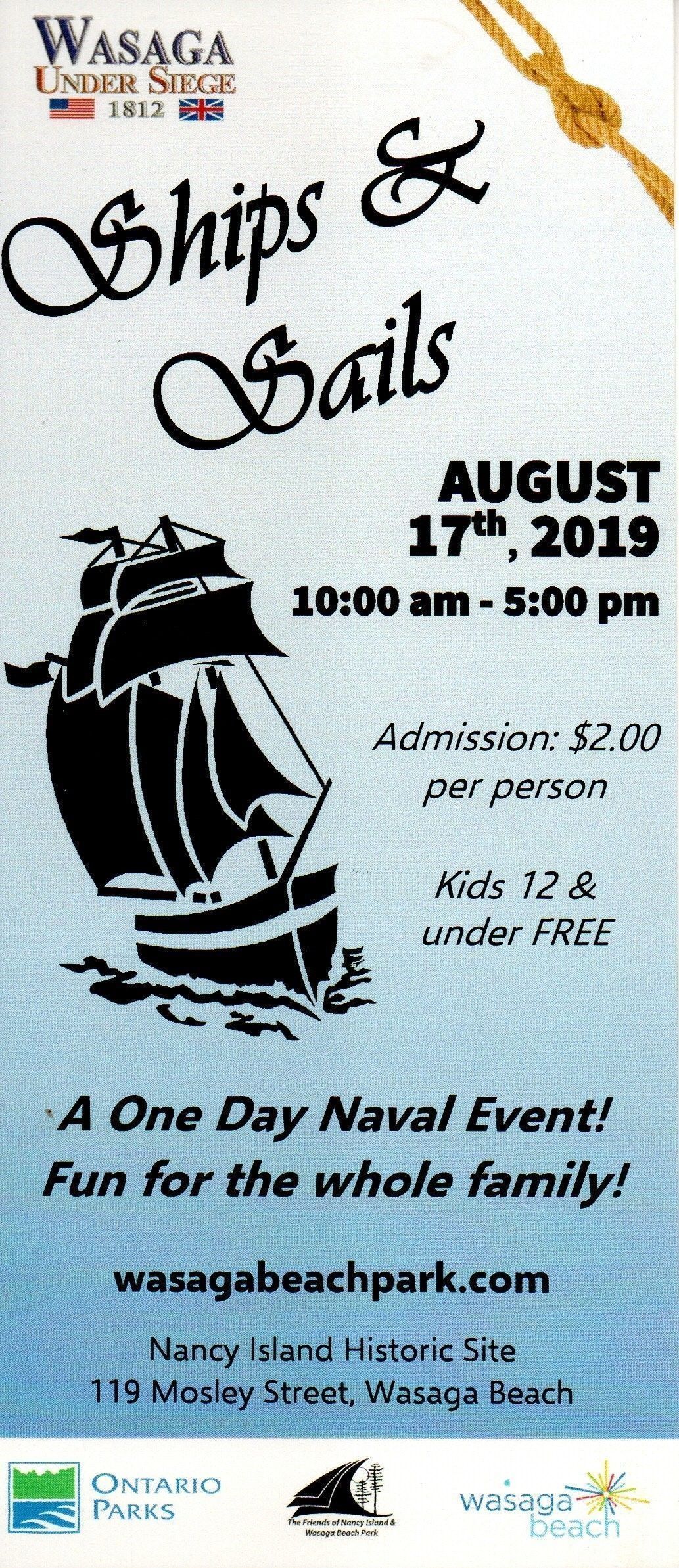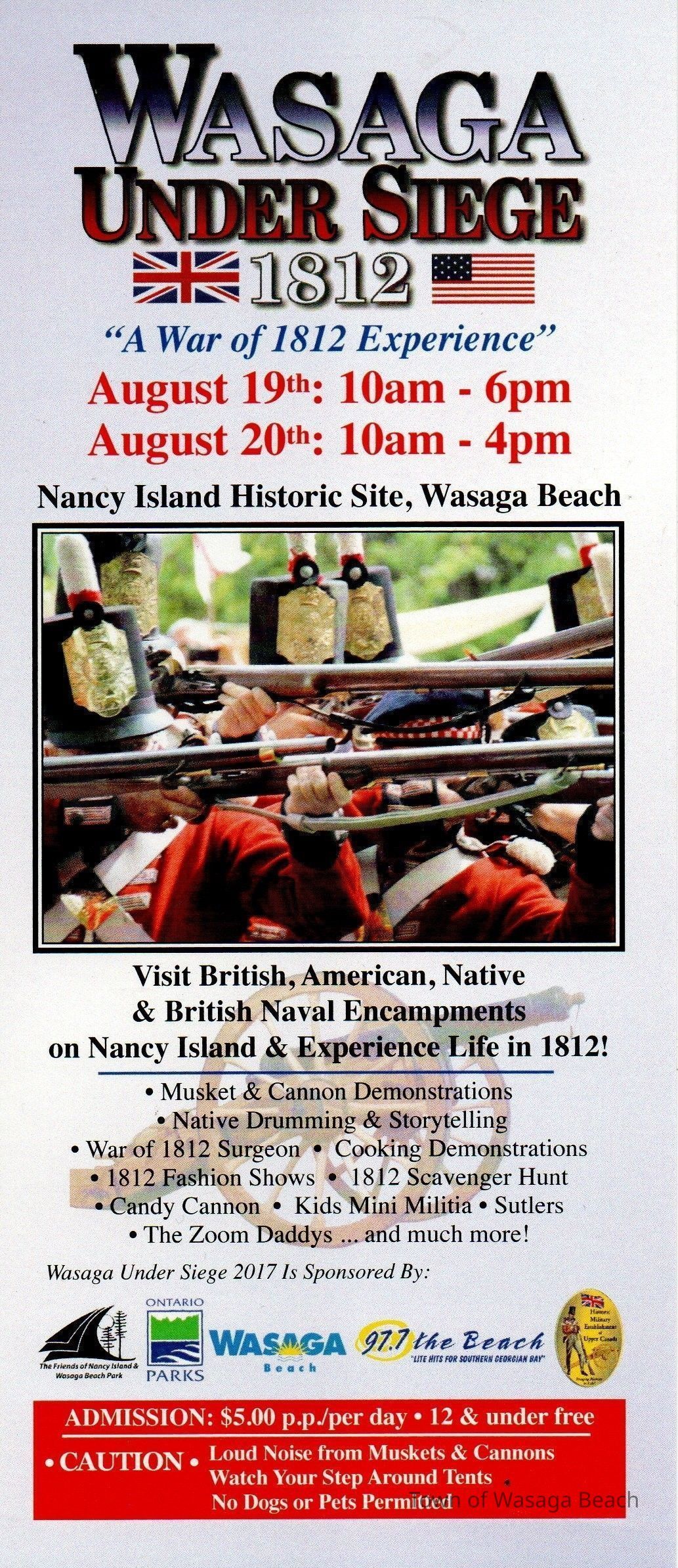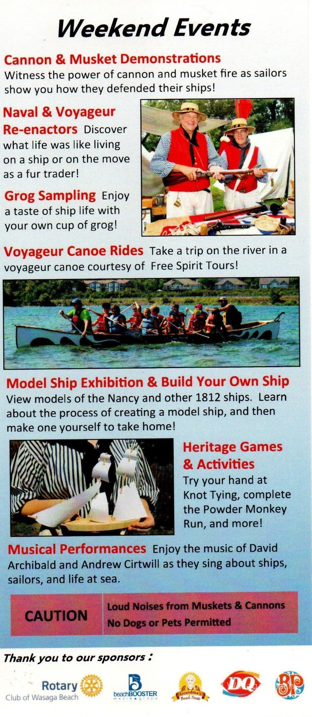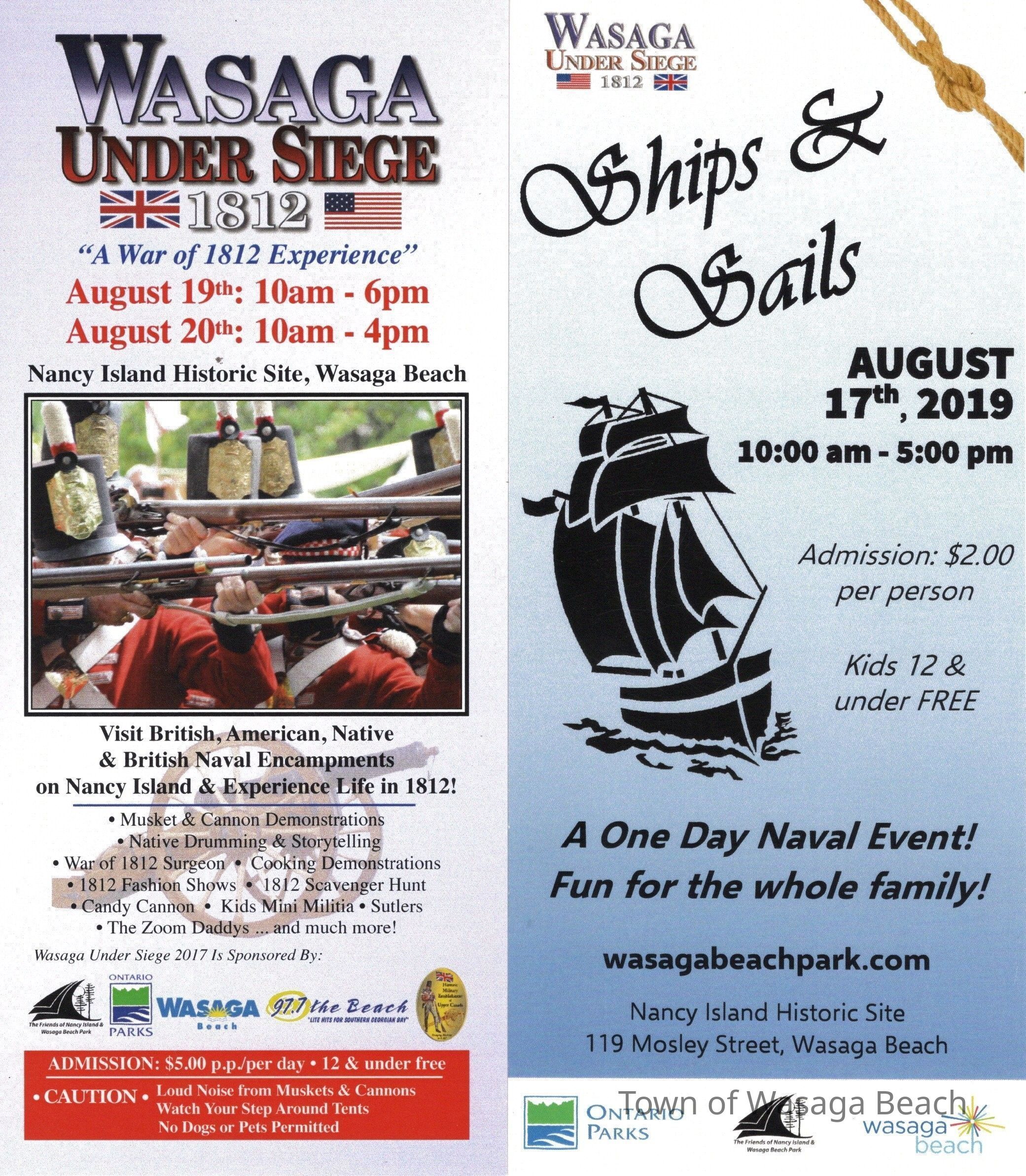 The flyer for each year, 2017 and 2019, lists demonstrations and events at Nancy Island Historic Site and in the Nottawasaga River. Admission fees and sponsors are also included on the flyers.Acquisition