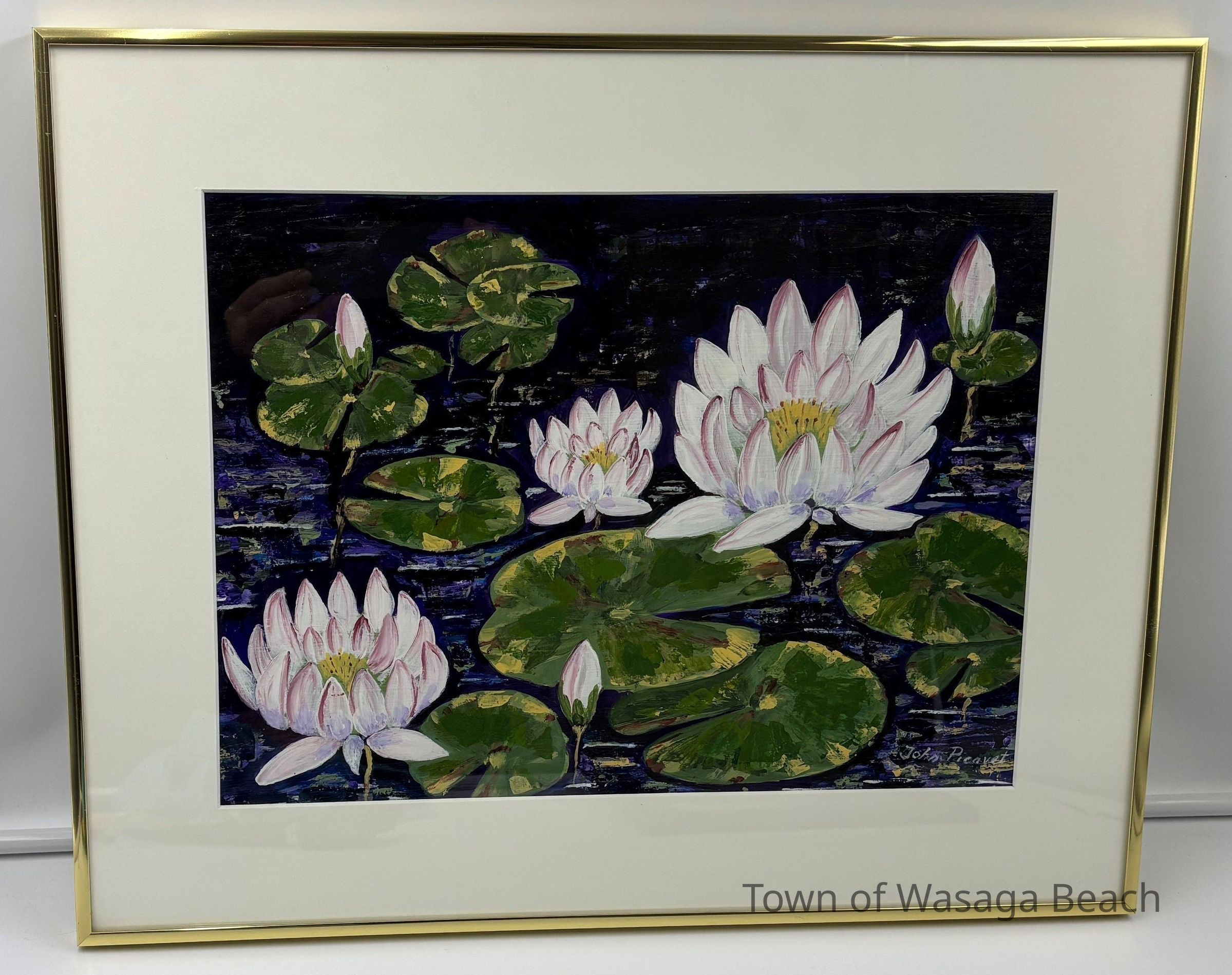 Framed painting of water lillies by John Picavet with a gold/brass colour frame and beige/off white mat.Acquisition