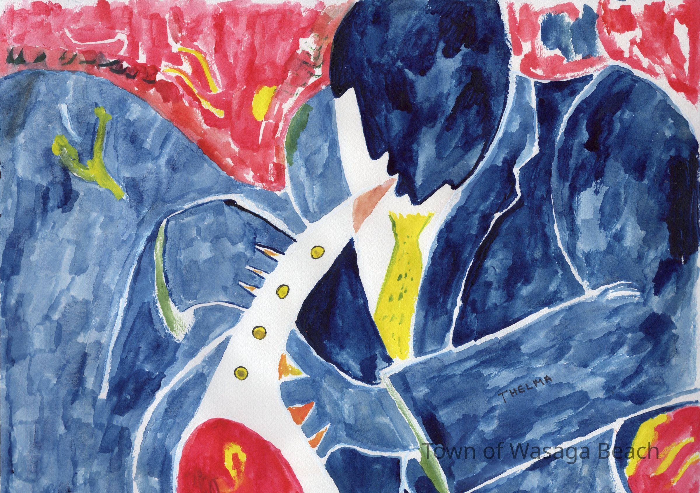 A watercolour painting by Thelma Morrison featuring a gentleman playing a saxophoneContext