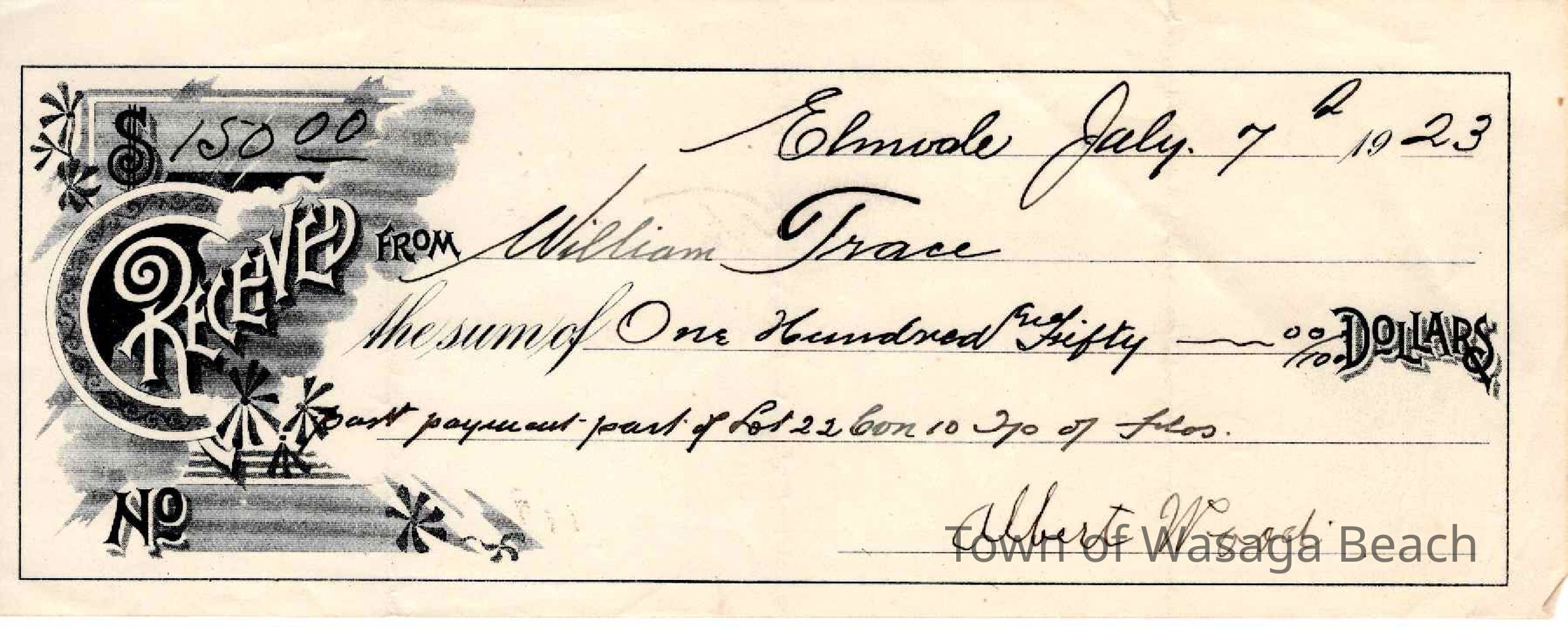 Receipt from Albert Wood to William Trace for payment of $150, part payment - part of Lot 22, Concession 10, Township of FlosAcquisition
