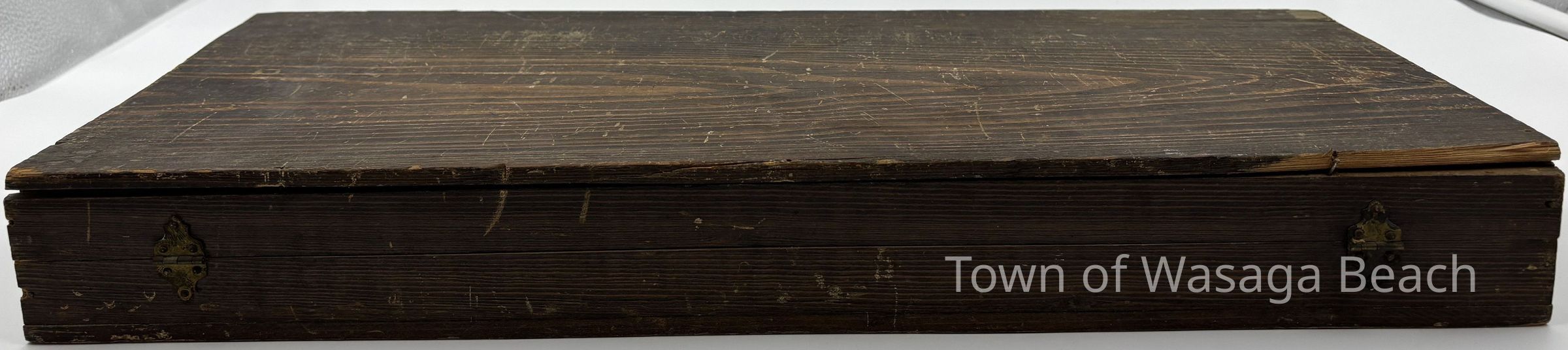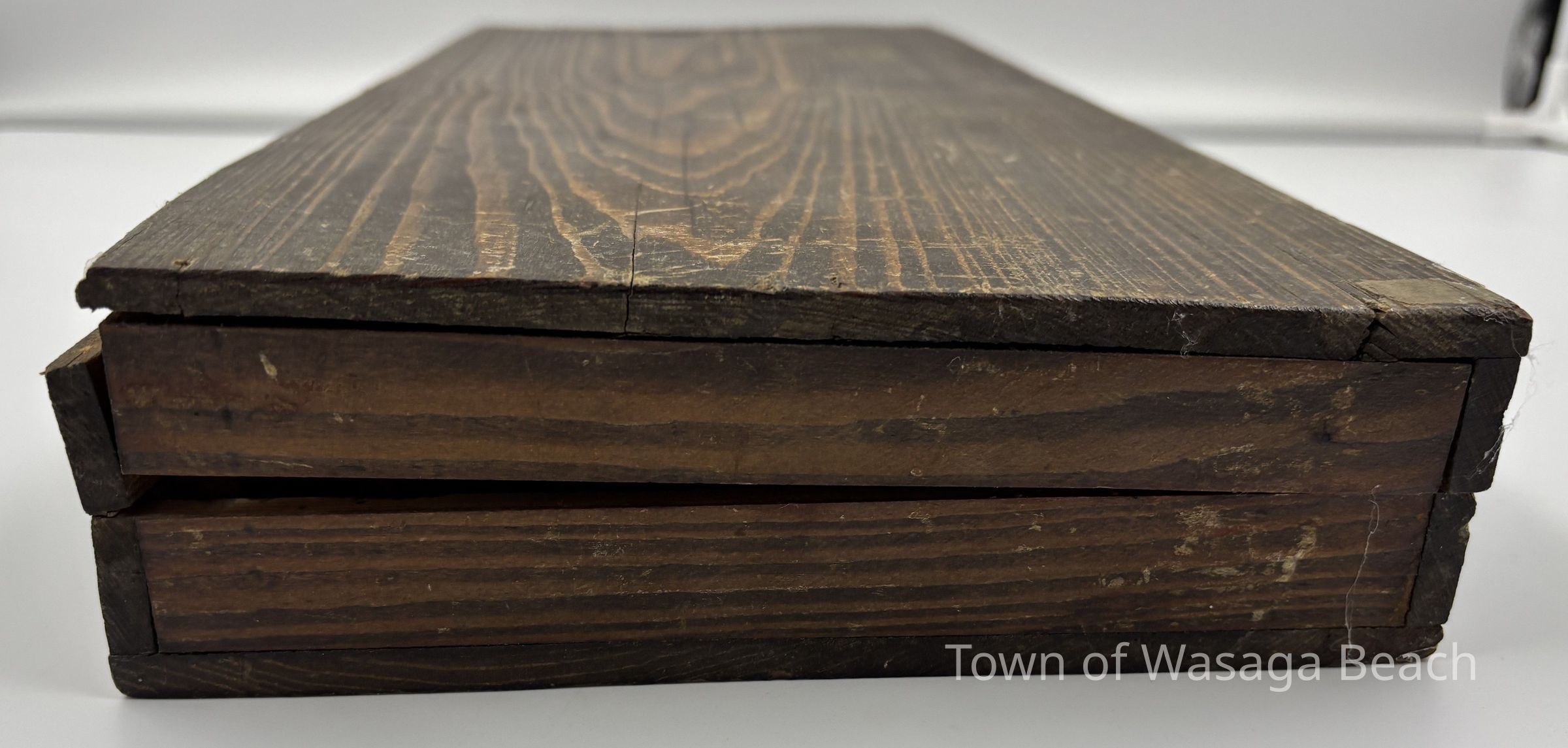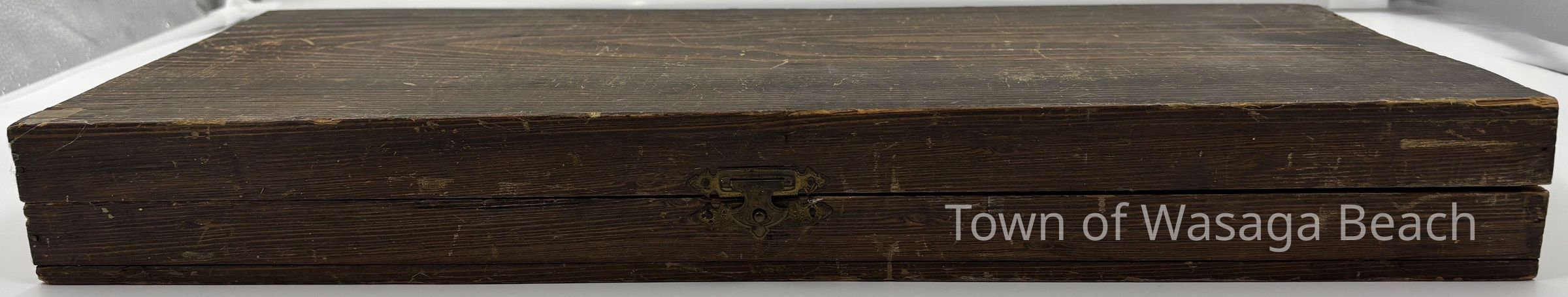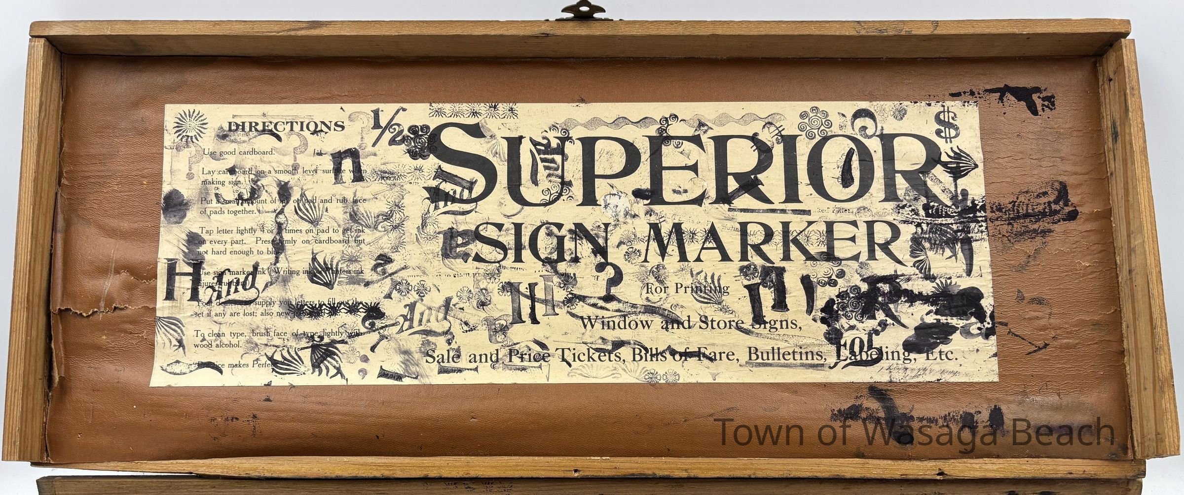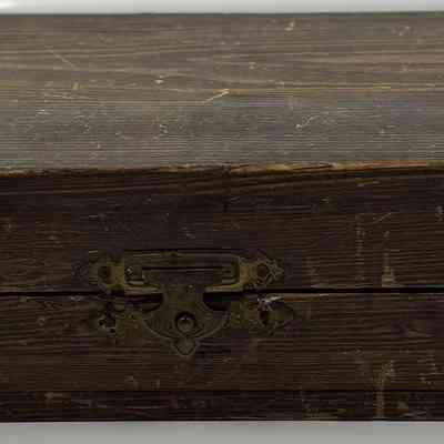 The inside of the lid is lined with thick tan coloured paper with a piece of beige/yellowish paper attached to it. Printed text is mostly on the beige/yellowish paper.Acquisition