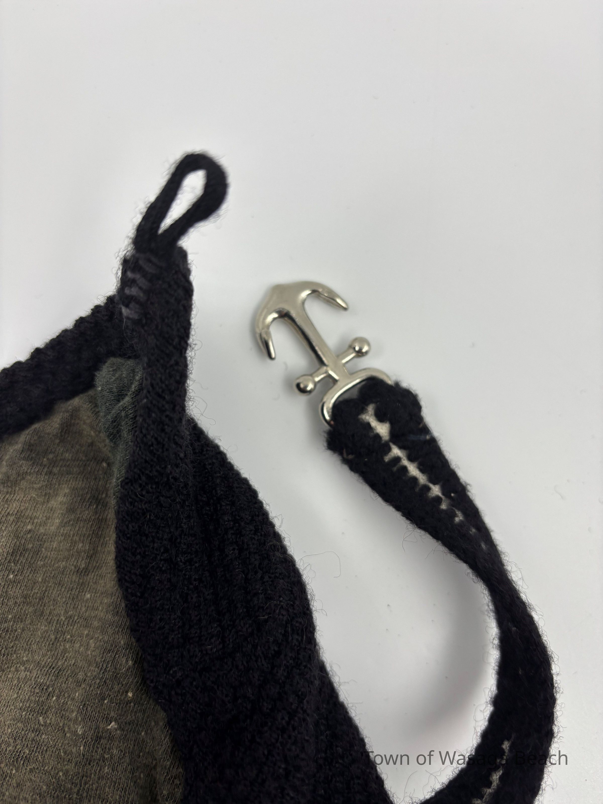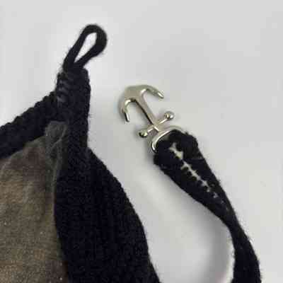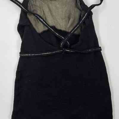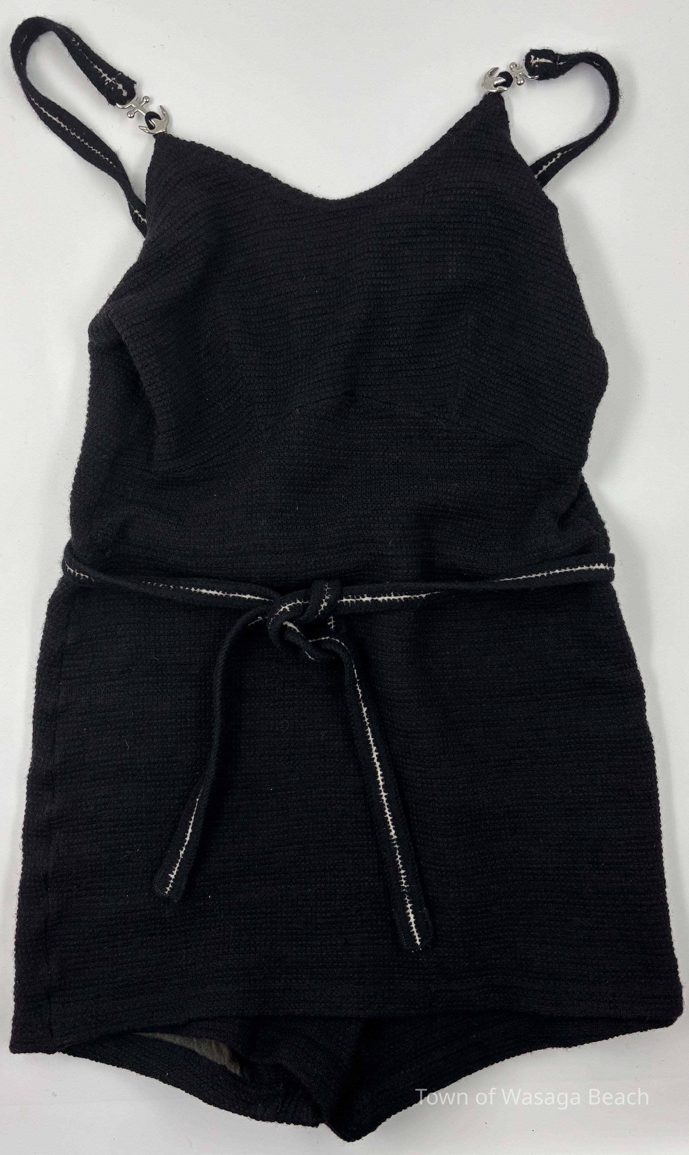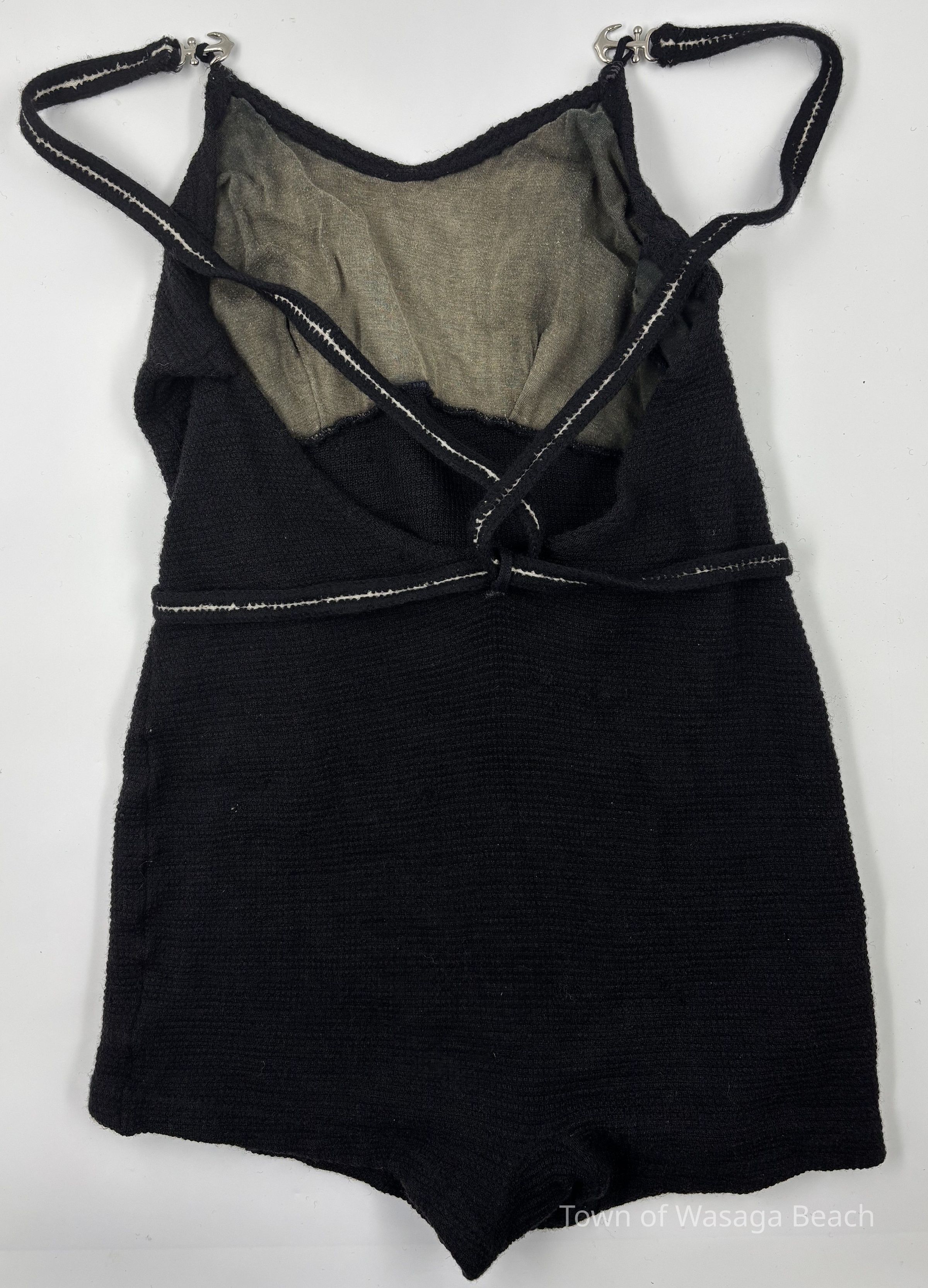 The vintage black wool bathing suit is one piece with shoulder straps, a tie at the waist and an apron front with wool shorts under it. The wool shoulder straps have an anchor shaped stainless steel hook attached to each strap. The shoulder strap with the anchor/hook goes over the shoulder and through a loop attached to the bathing suit. The hooks and eyes/loops will allow individuals to put on or take off the garment. There are wool knit straps attached to the back of the bathing suit that tie around the waist. The chest area and rear section of the garment are lined with jersey material.