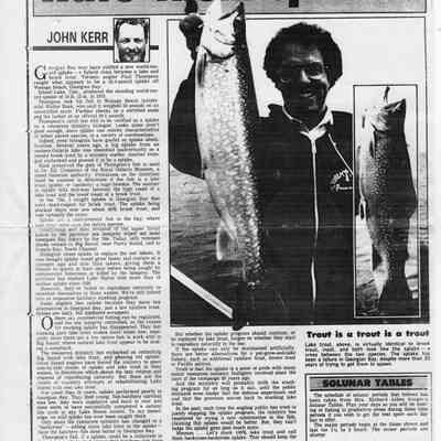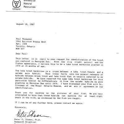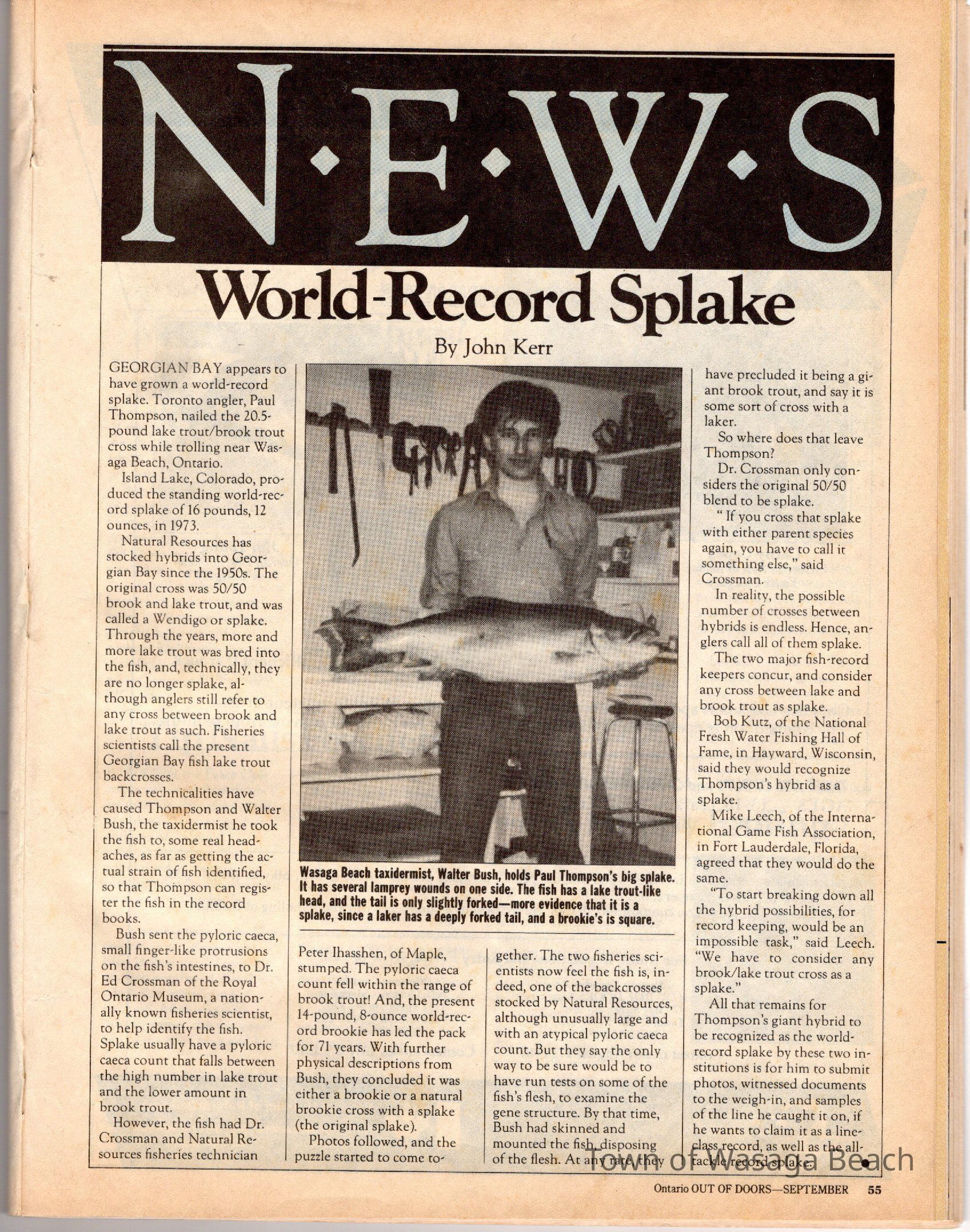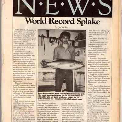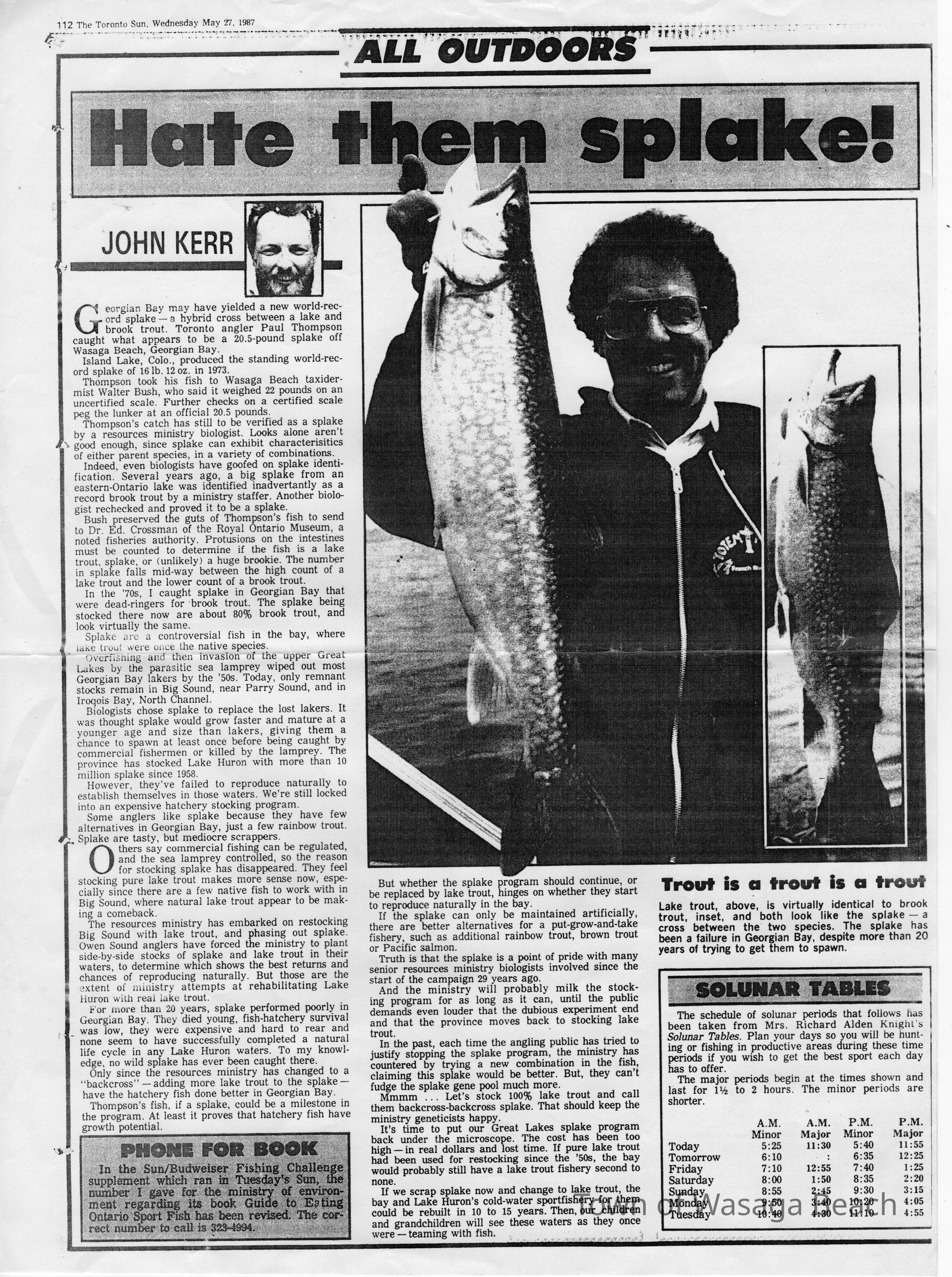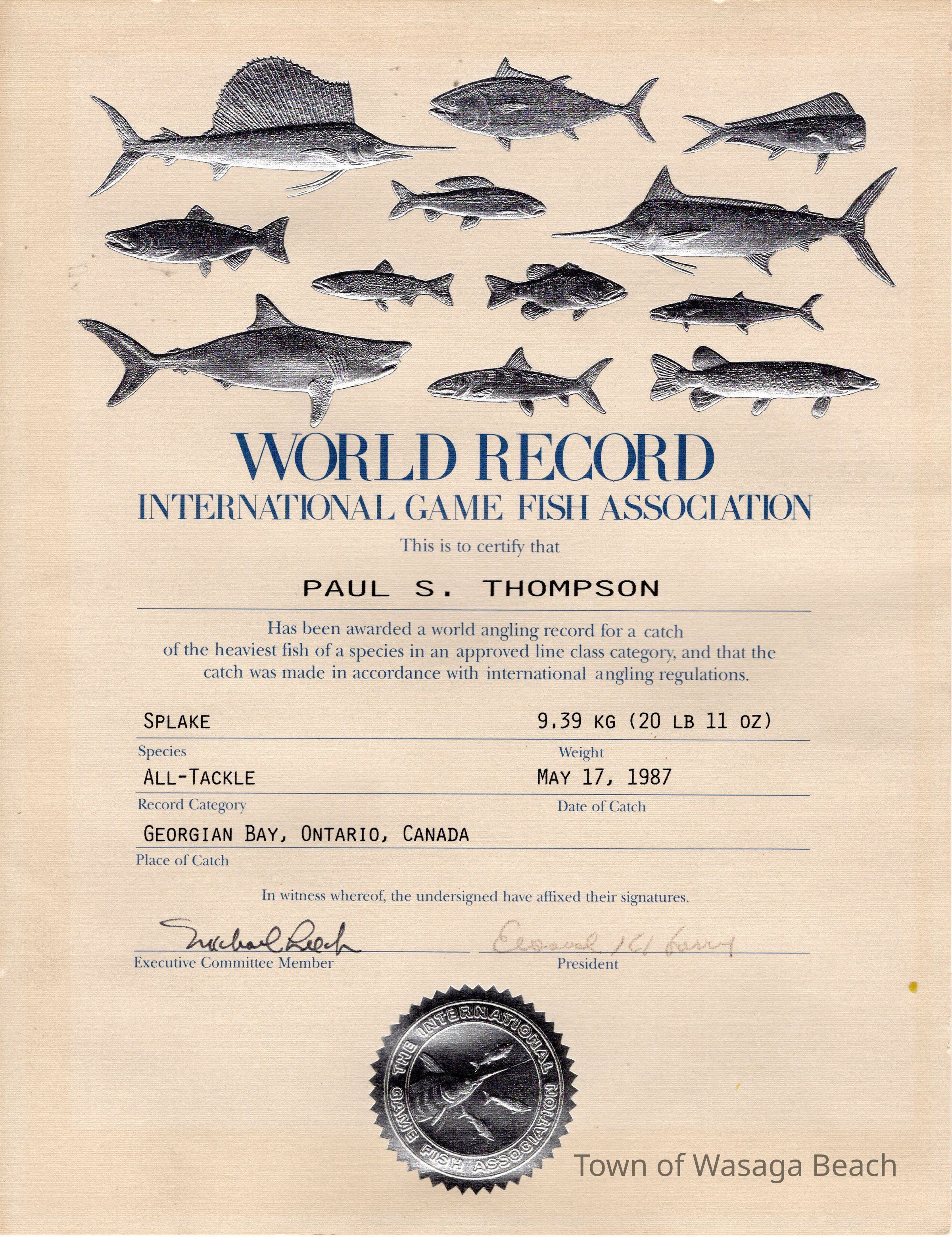 An article in the Toronto Star, Wednesday May 20th 1987, notes "this 35-inch splake’s a world record caught by Mr. Paul S. Thompson of Toronto, Ontario. He was in Nottawasaga Bay east of the mouth of the River on May 17th 1987."