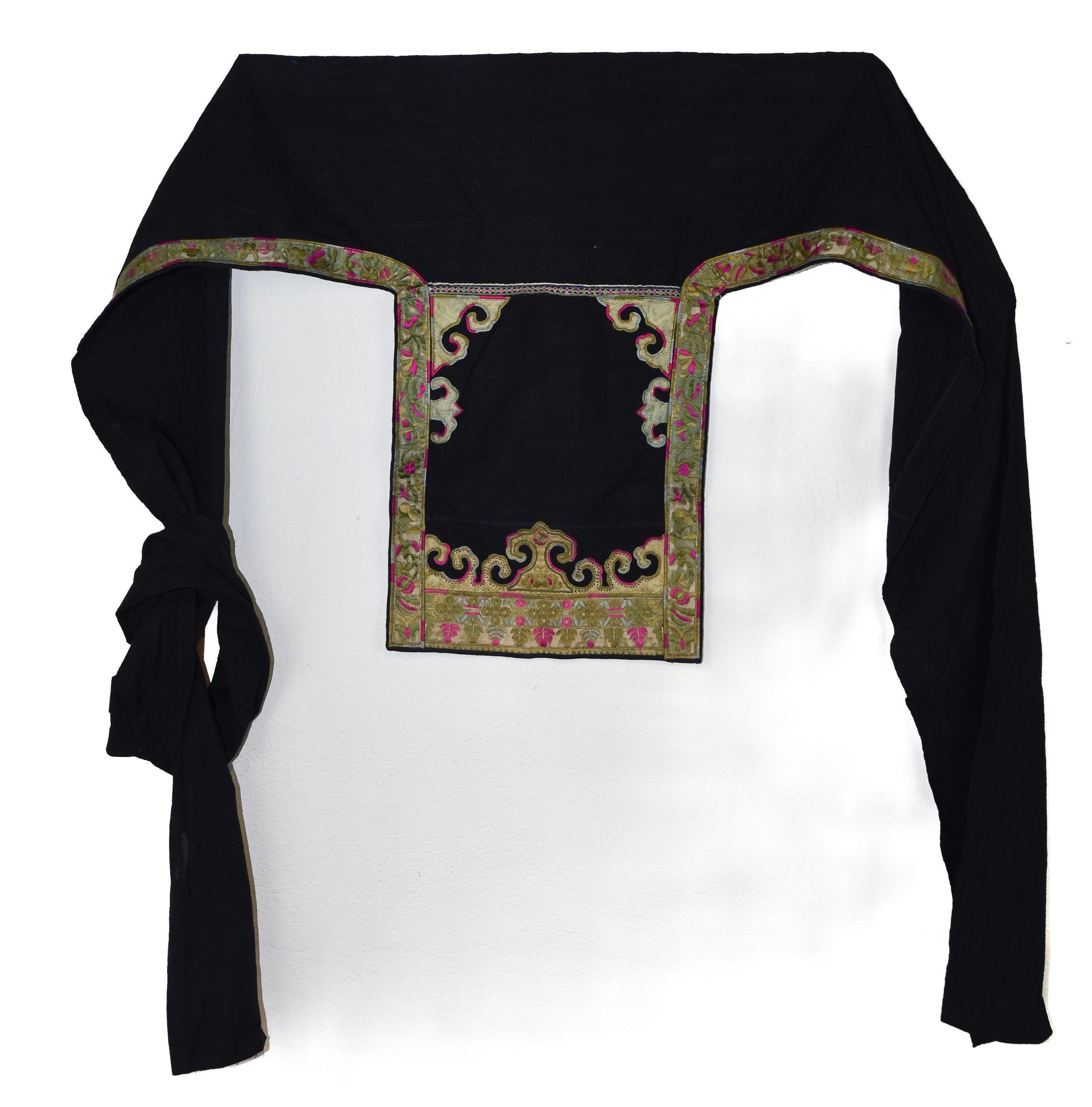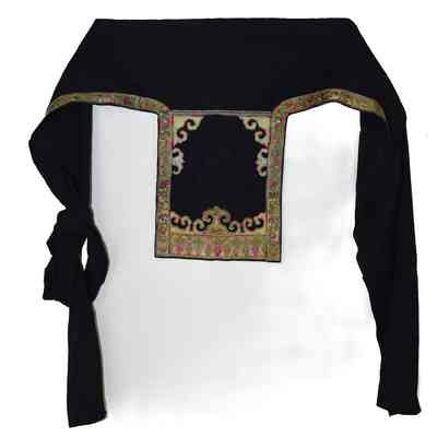 Baby carrier, hand woven black cotton with sort of a twill surface with silk embroidered bands and pieces sewn onto the cotton small hole on the black bands.
