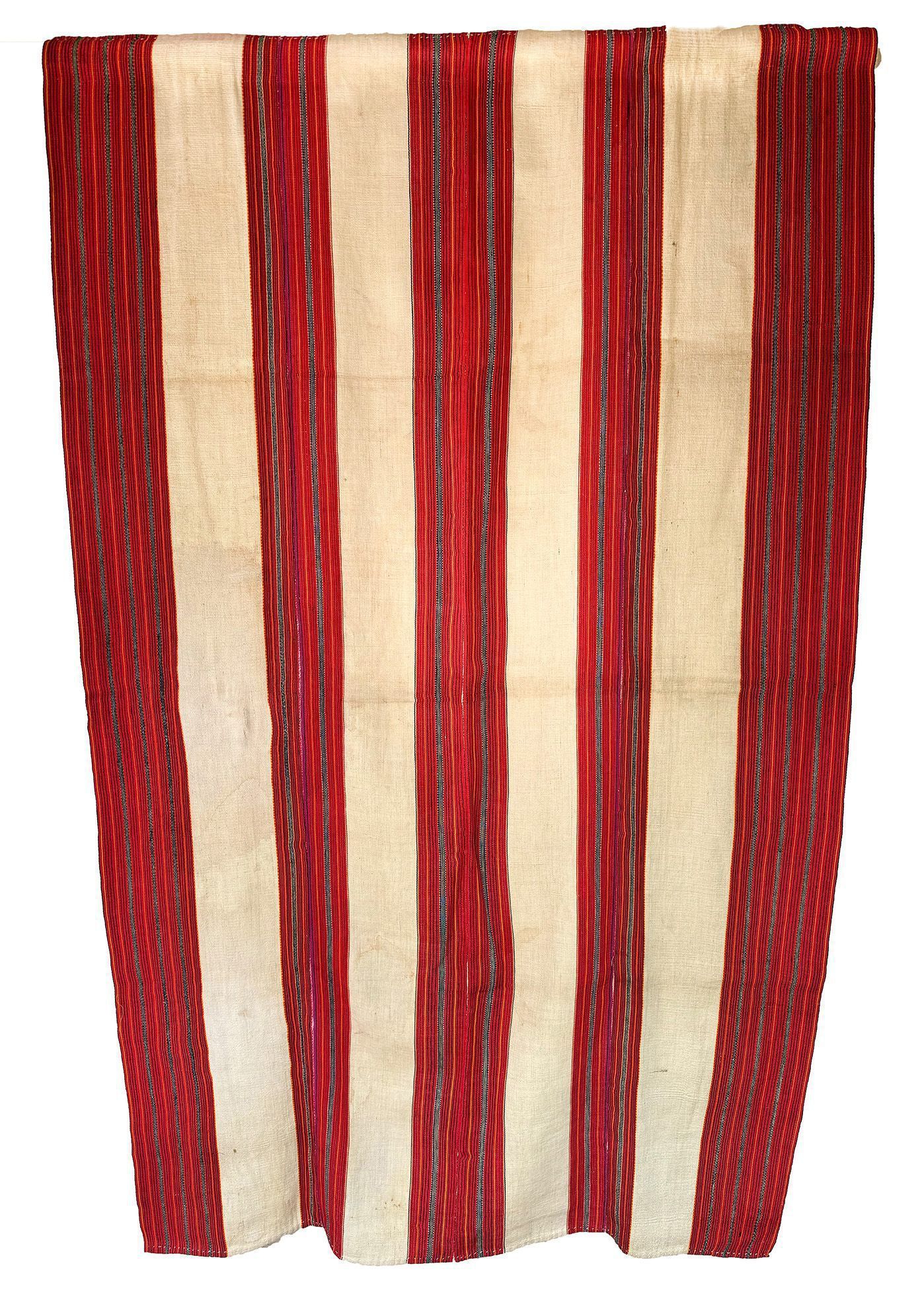 A four-panel cloth of undyed cotton with colored stripes, known as a “Lilabey” — a blanket and woman’s garment.Acquisition