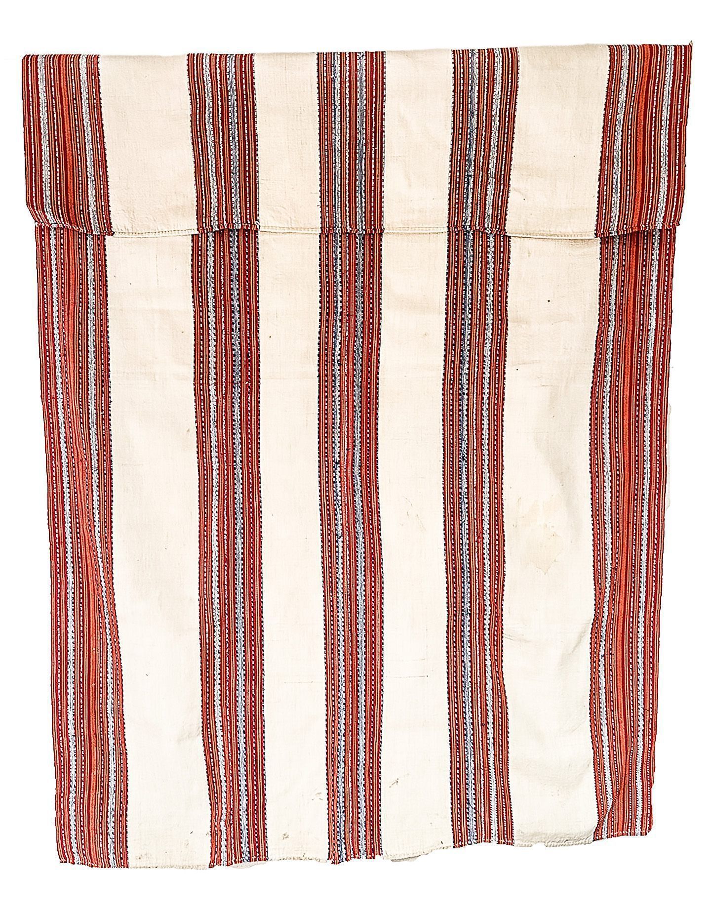 A four-panel cloth of undyed cotton with colored stripes, known as a “Lilabey” — a blanket and woman’s garment.Acquisition