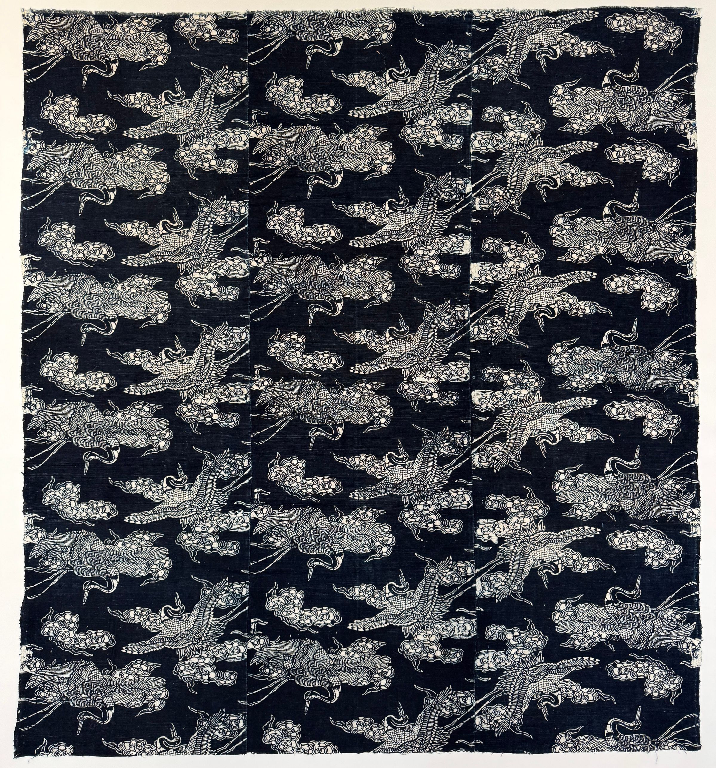 Rectangular blue cotton cloth with white design of flying cranes amongst clouds. Three panels are sewn together. The design was done with rice-paste resist applied using stencil and then dyed (katazome).Acquisition