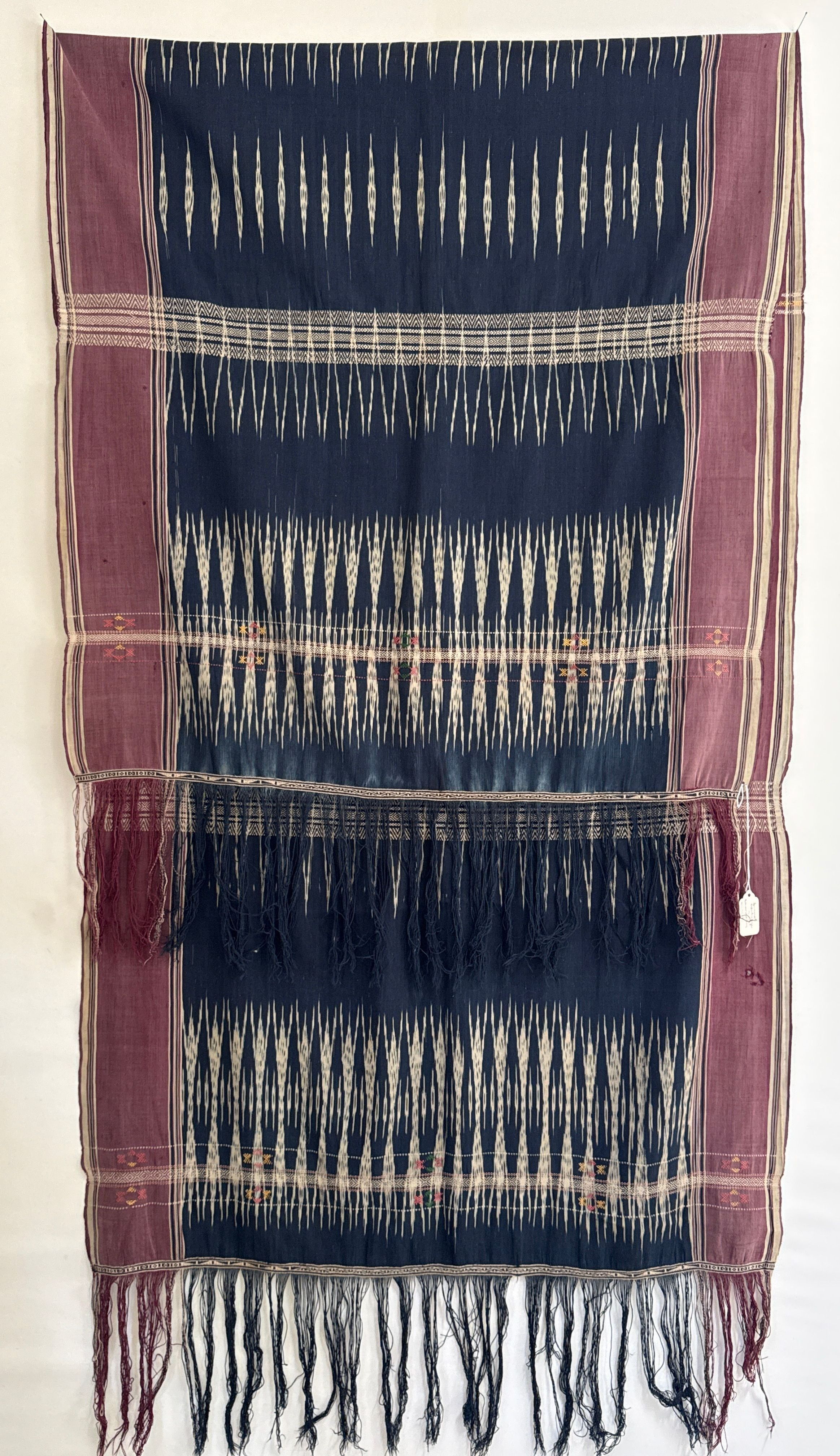 This textile, originating from the Batak people of North Sumatra, is a single, long piece of densely woven cloth. Its striking design features a dark blue center panel adorned with crisp white elongated diamonds and triangles in ikat technique. The two side borders features a wide maroon stripe flanked by a mix of narrow stripes in blue, white, and maroon. Renny Manurung identified the piece as an ulos type called Sibolang Rasta Marjungkit. Rasta because it has a red border and marjungkit because of the supplementary-weft patterning.