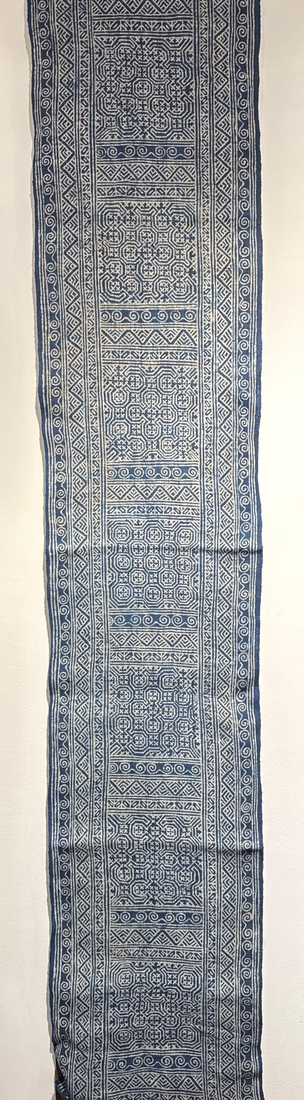 A long banner of batik cloth made by the Hmong people. Newly made.