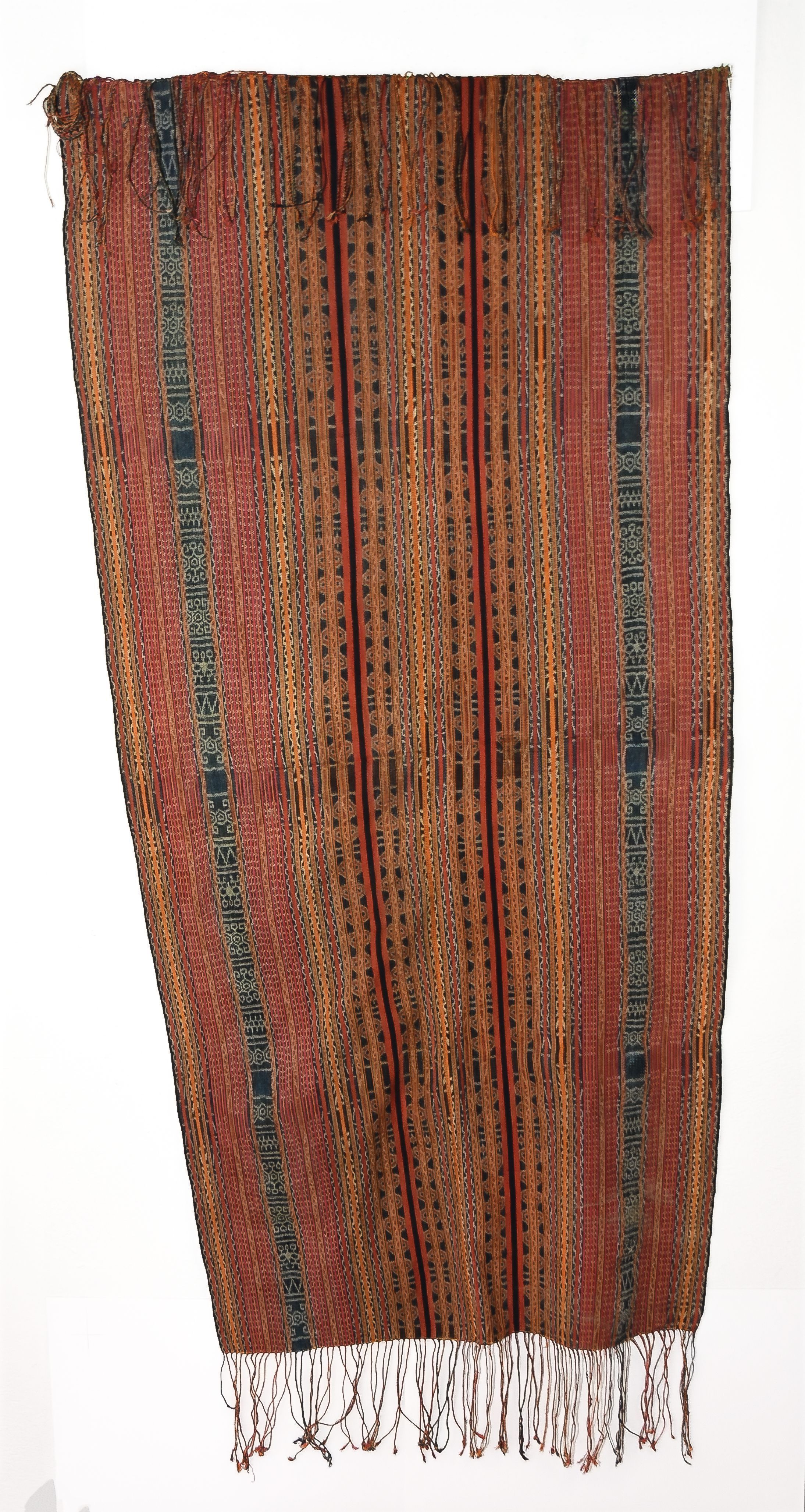 A wide one-panel cloth in blue-and-white warp ikat and colored stripes. See a similar piece in: “Textiles of Timor, island in the woven sea”, Hamilton & Barrkman, page 218.Acquisition
