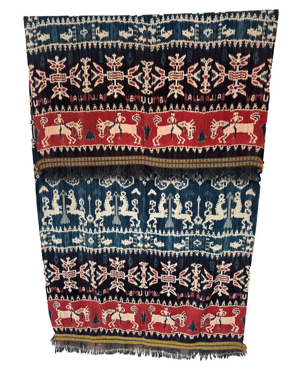 A two-panel warp ikat cotton cloth decoratedl lions from Dutch coat of arms, men on horseback, geometric symbols and words "Umbu Balla" (Lord Balla). The ends are finished with a narrow weaving known as kabakil.Acquisition