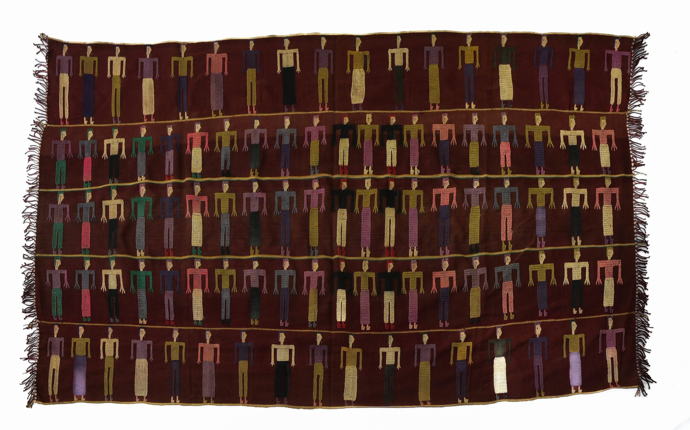 A three-panel cotton cloth with brown background and five rows of standing figures in trousers and sarong skirt in supplementary-weft wrapping. The warp ends are finished with twined fringes.Acquisition