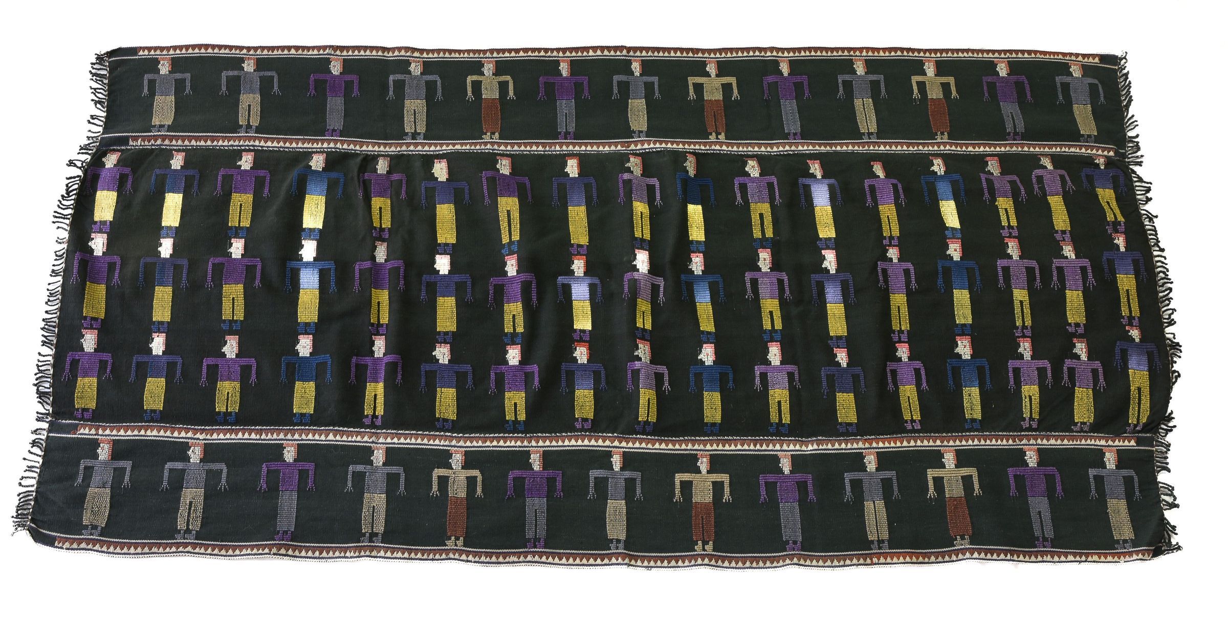 A three-panel cotton cloth with black ground and five rows of men in supplementary-weft wrapping, The men wears pants or sarong, arms outstretched pointed downward. Fringed edges.Acquisition