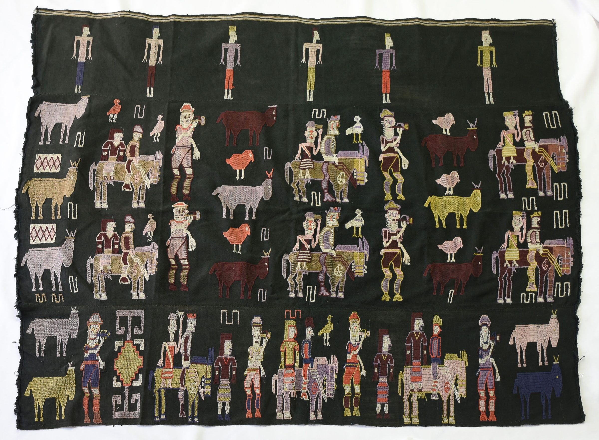 A three-panel cotton cloth for wrapping around the waist. This cloth is made of cotton. It has a dark ground and polychrome patterns in supplementary-weft wrapping. It depicts four rows of standing figures and people on horseback, horses, deer, and birds. Some figures appear to be playing a musical horn. The ends are unfinished.Acquisition