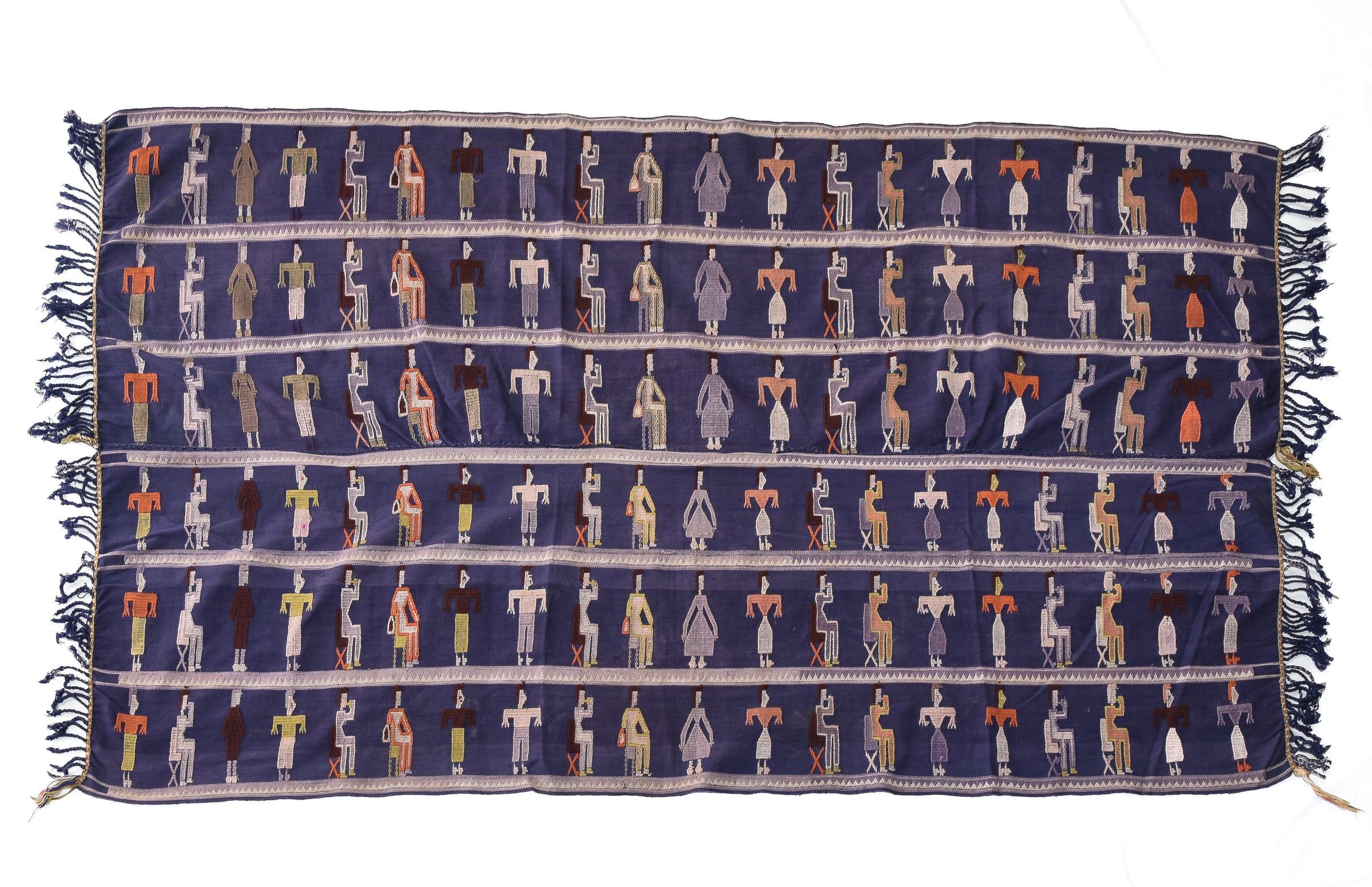 A two-panel cotton cloth in purple with fringe. Newer, maybe an experiment in color or responding to buyers. Six rows of male figures standing and seated on chairs and female figures standing plus six border rows all in supplementary-weft wrapping technique (buna).Acquisition