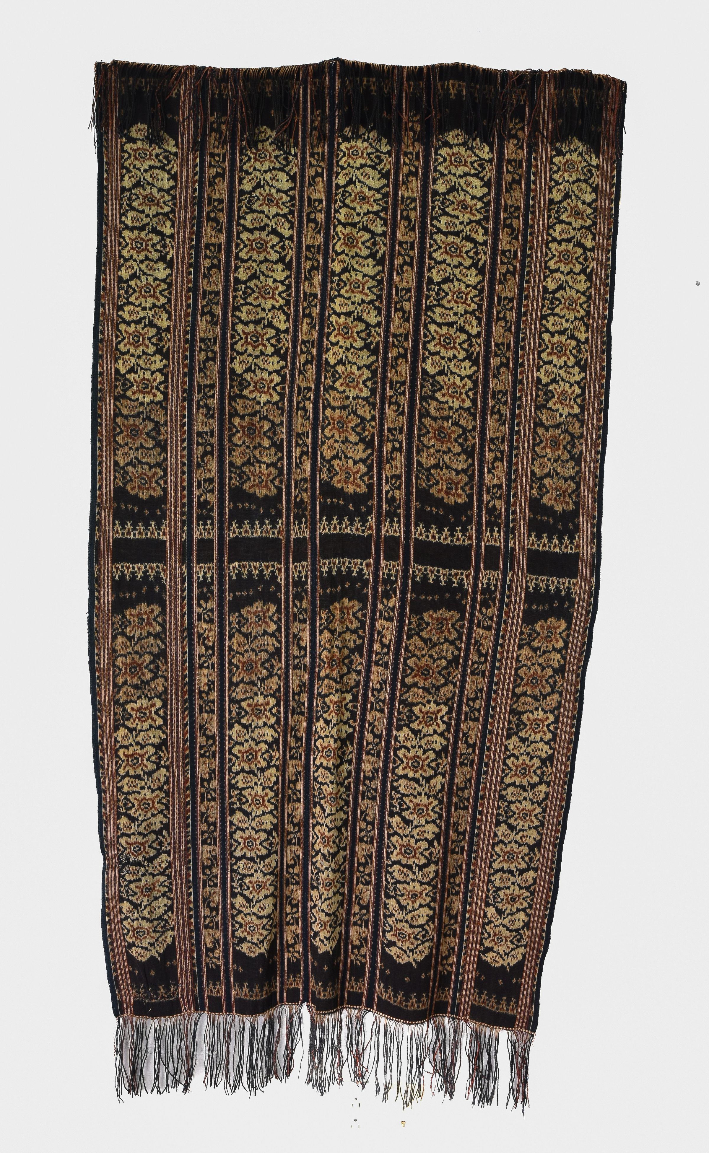 A two-panel cotton cloth in warp ikat depicting five bands of floral motifs on dark ground (made of red with blue overdying). One of the panel has three bands and the other two bands. The warp ends are worked into a twined fringe.