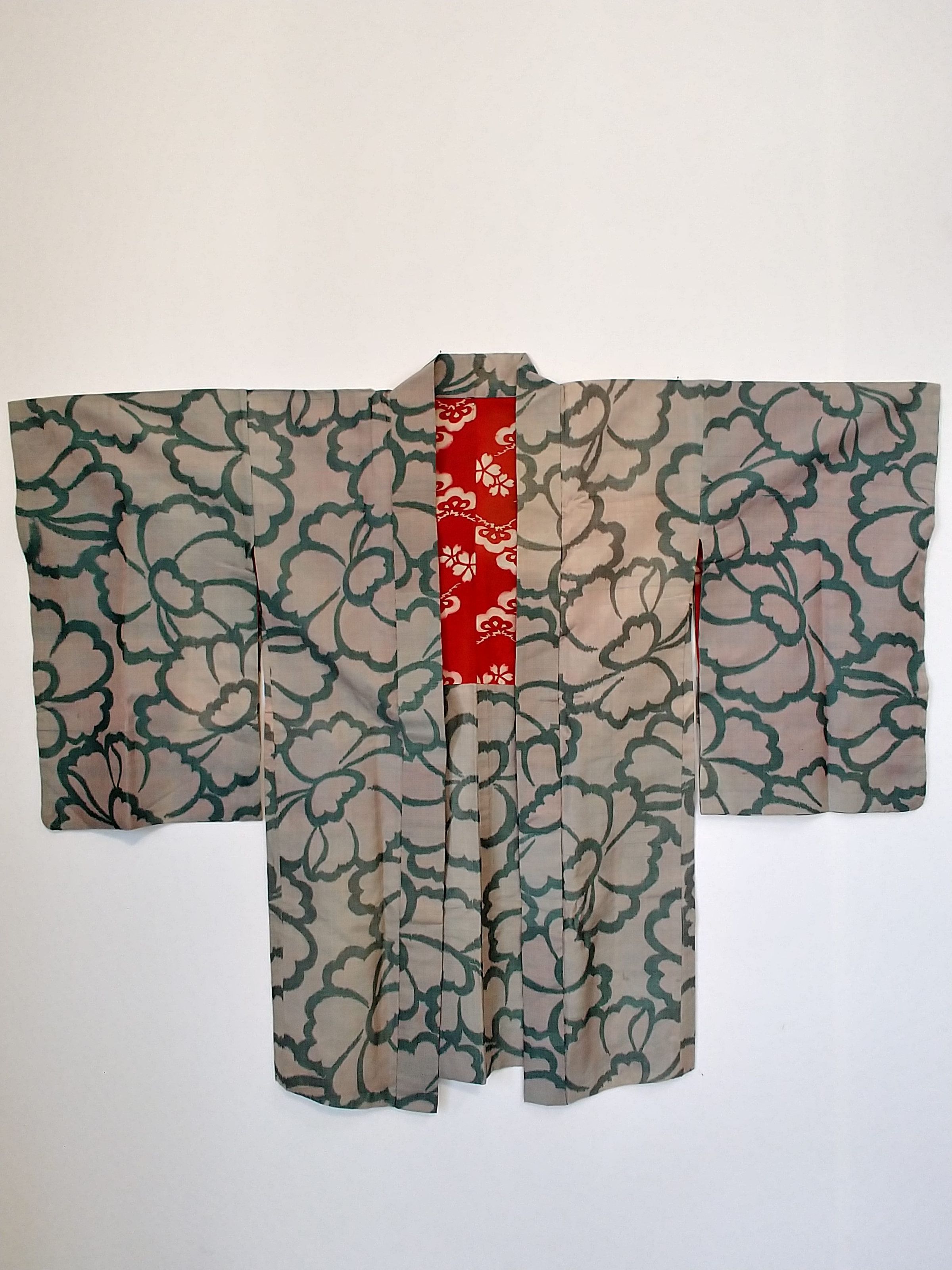 Haori jacket with aqua and gray crysanthemums flower-patterned ikat lined with orange and pink fabrics.Acquisition