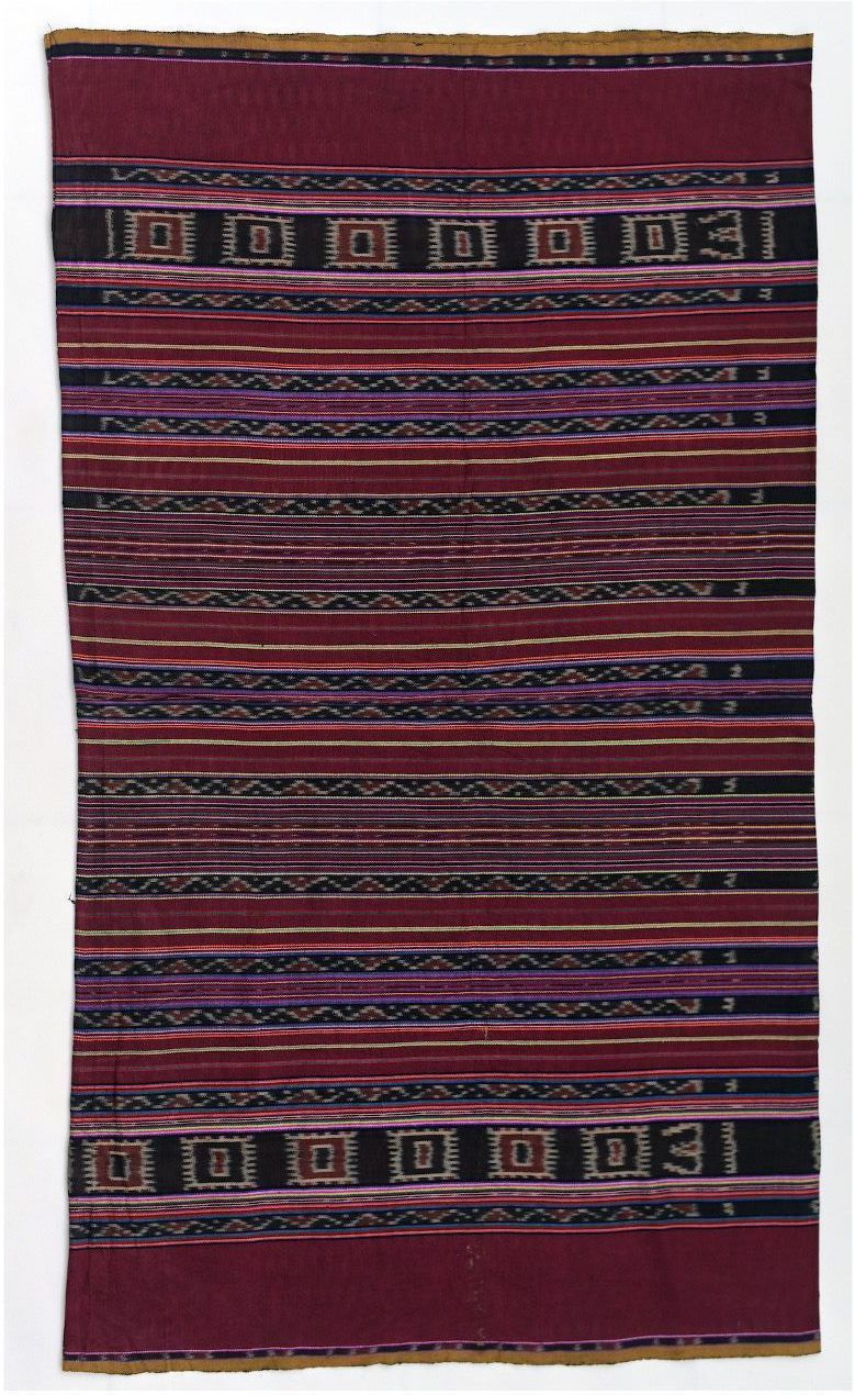 Tenapi is a general local term for a tube skirt. This garment consists of two panels of red-ground cloth adorned with warp ikat patterns. The primary decorative warp ikat bands are located towards the top and bottom of the skirt, while numerous secondary bands are located in the middle section.Acquisition