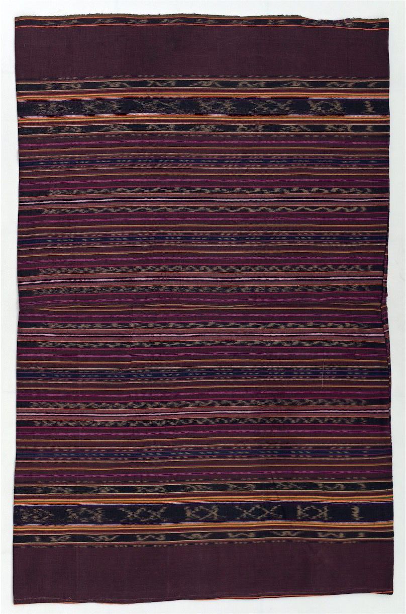 In Alor, specific types of tenapi, or tube skirts, are worn by distinct patrilineal lineages. These lower garments are named based on their design format and motifs, but these names do not have particular meanings. This tenapi is composed of two panels of brownish-red, warp ikat cloths adorned with primary warp ikat bands at the skirt's top and bottom. The Tenapi Fadang tube skirt is recognizable by its green and blue stripes, which are positioned next to narrow bands of warp ikat dashes in the middle section of the skirt.Acquisition