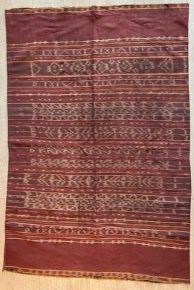 In Alor, specific types of tenapi, or tube skirts, are worn by distinct patrilineal lineages. These lower garments are named based on their design format and motifs, but these names do not have particular meanings. This tenapi is composed of two panels of brownish-red, warp ikat cloths adorned with primary warp ikat bands at the skirt's top and bottom. The Tenapi Fadang tube skirt is recognizable by its green and blue stripes, which are positioned next to narrow bands of warp ikat dashes in the middle section of the skirt.Acquisition