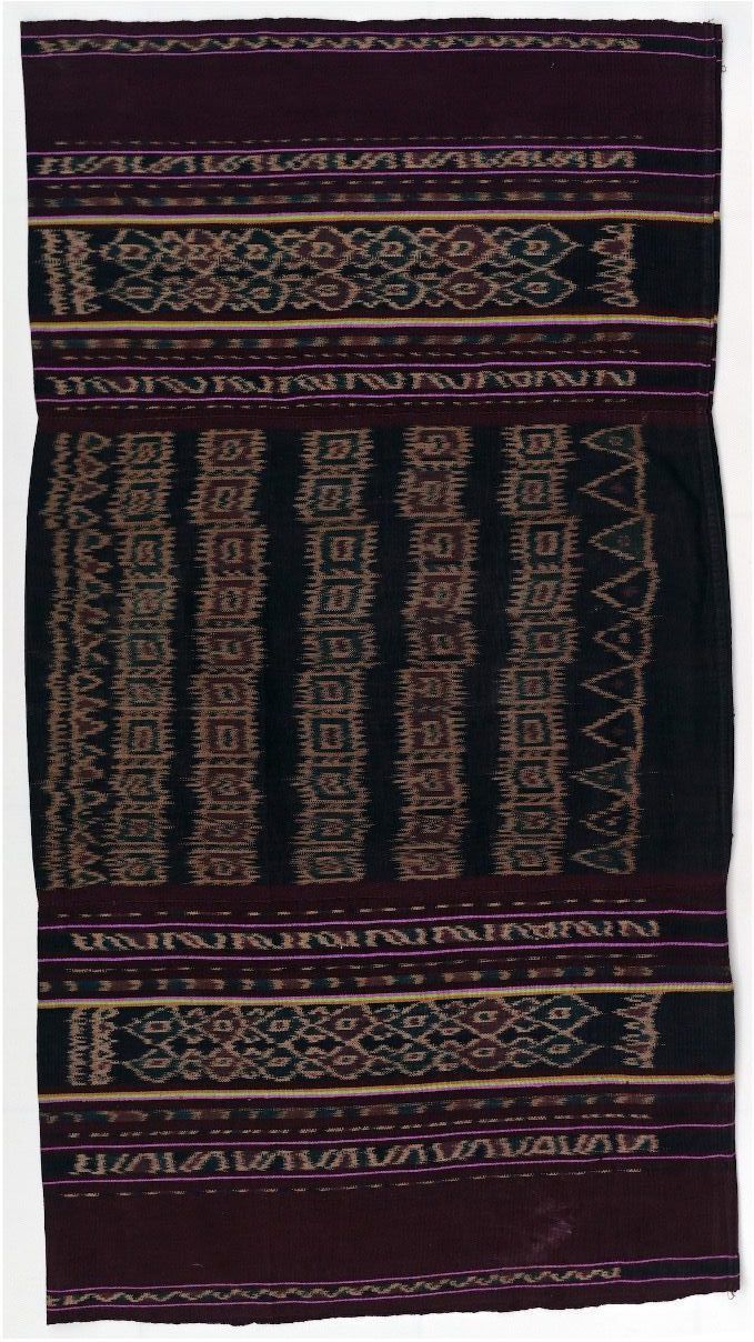 The Tenapi Fatola Bao Lolong is worn by the ruling patrilineage or Suku Uma Kakang. It is composed of three panels of warp ikat decorated cloth. The middle section features a repetitive pattern of baololong or banyan leaves. The term 'fatola' originates from 'patola', referring to imported double ikat silk textiles woven in Gujarat, India, which were the prerogative of royal families.Acquisition