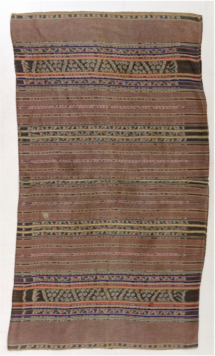 In Alor, certain types of tenapi, or tube skirts, represent specific patrilineal lineages, while others are neutral and do not signify a specific lineage. These lower garments are named for their design format and motifs, but the names do not have specific meanings. This tenapi consists of two panels of brownish-red-ground warp ikat cloths decorated with primary warp ikat bands at the top and bottom of the skirt. The middle section is adorned with three secondary warp ikat bands.Acquisition