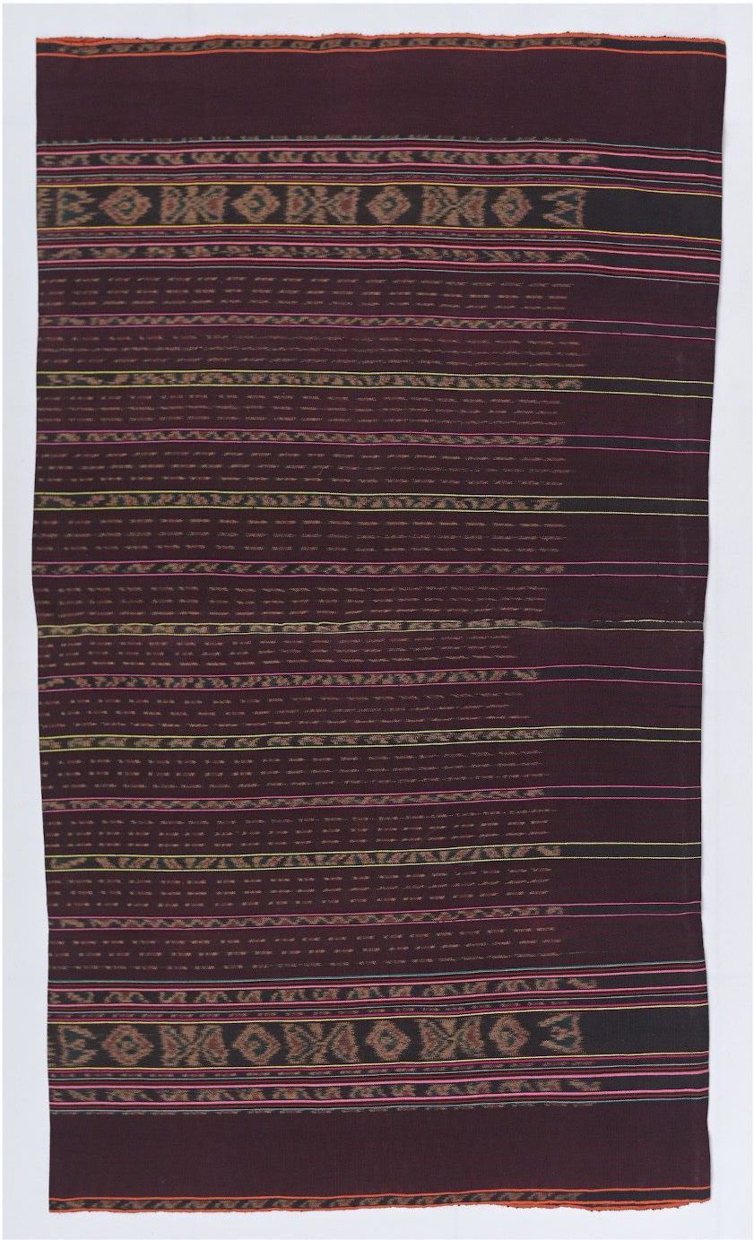 Tenapi Matang Karing means a tube skirt with "small eyes" patterns. This garment is worn by members of the Suku Uma Aring (Younger/Youngest Brother) patrilineage, part of the Alurung ethnic group from the Umapura Village on Ternate Island, Alor Regency. Tenapi Matang Karing consists of two panels of warp ikat decorated cloths. The ground color is traditionally dyed with morinda, producing a brown-red color. Each panel features a primary warp ikat band and many secondary bands. The primary bands are located near the top or the bottom of the skirt. The secondary bands are adorned with various patterns, such as coconut tree fronds (lolong), boats (tena), and undulating lines (kago no eking). There are also many warp ikat dashes called little flowers (peku-peku) or broken bettle nut fruit (malu gilu). The skirt often includes bright stripes of commercially dyed purple and pink, which divide the ikat bands.Acquisition