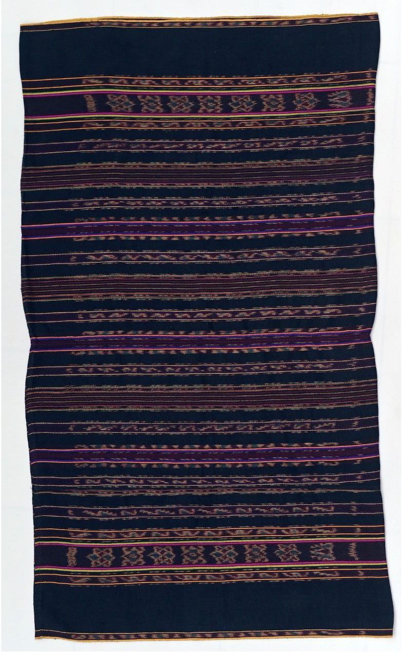 In Alor, specific types of tenapi, or tube skirts, are worn by distinct patrilineal lineages. The names of these lower garments are based on their design format and motifs, but do not carry specific meanings. This tenapi consists of two panels of warp ikat cloth, with main warp ikat bands at the top and bottom of the skirt. The Tenapi Moubehi is identifiable by its groupings of red and blue (black) stripes, which alternate with bands of warp ikat.Acquisition