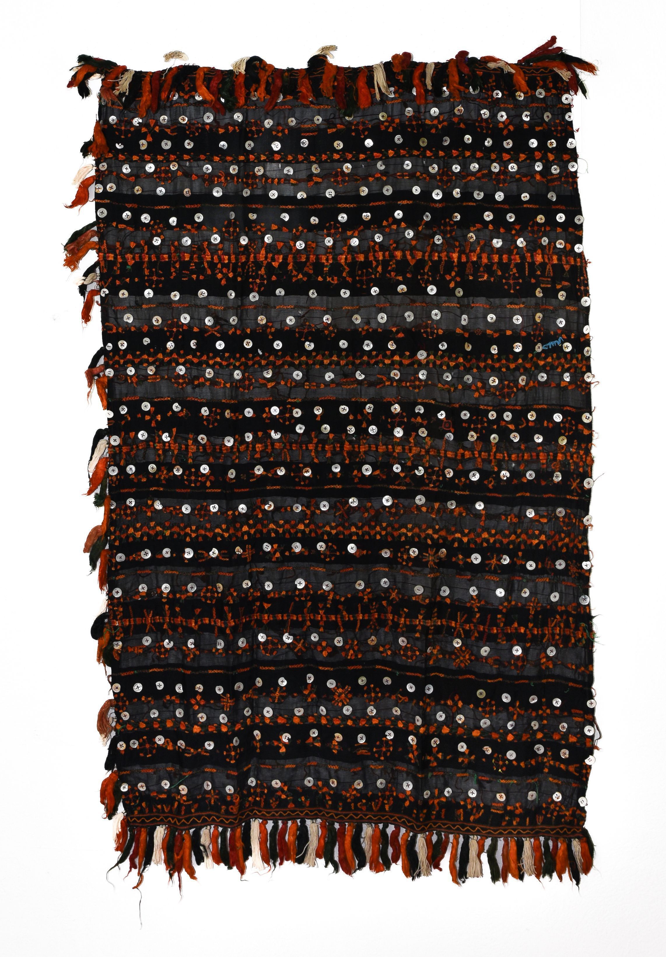 A shawl made of fine silk worn as a head covering by the bride in Siwa Oasis. It is embroidered in traditional colors with mother-of-pearl buttons and a many tassels on three sides. The local name of this shawl is said Turket Nakbir Elharir. The ground fabric is woven with highly twisted silk yarns has bands of damask patterns. The fabric was supposedly woven in Cairo or Alexandria, while the embroidery done in Siwa. There is a green writing in Arabic.Acquisition