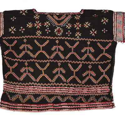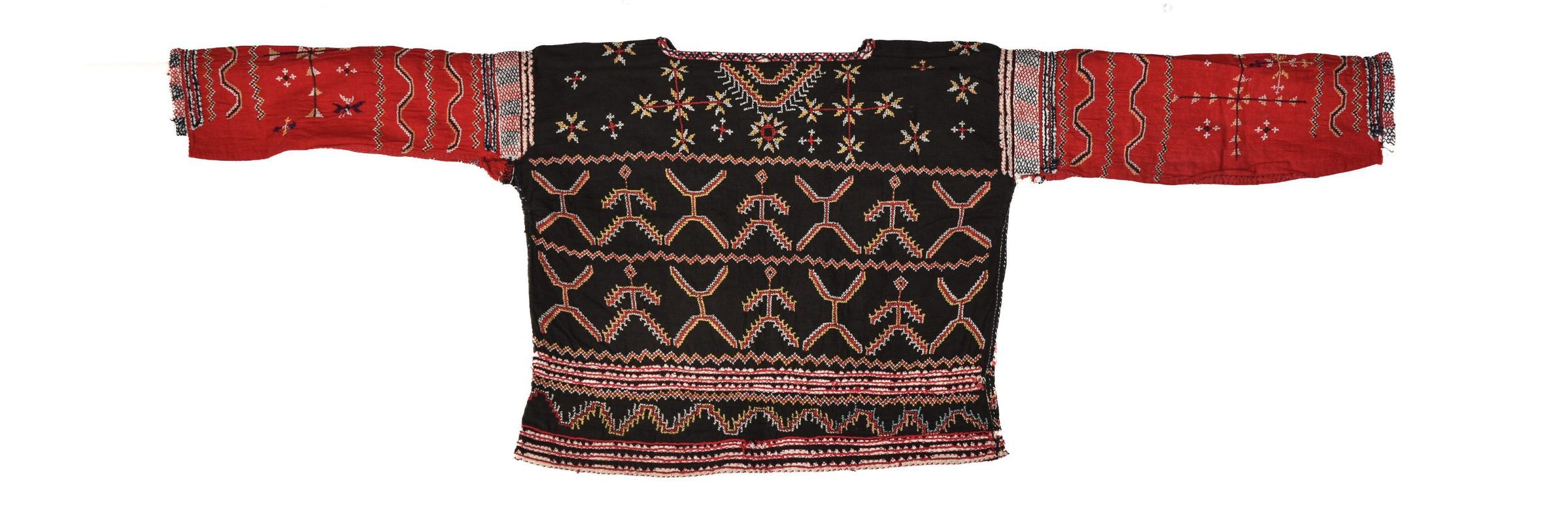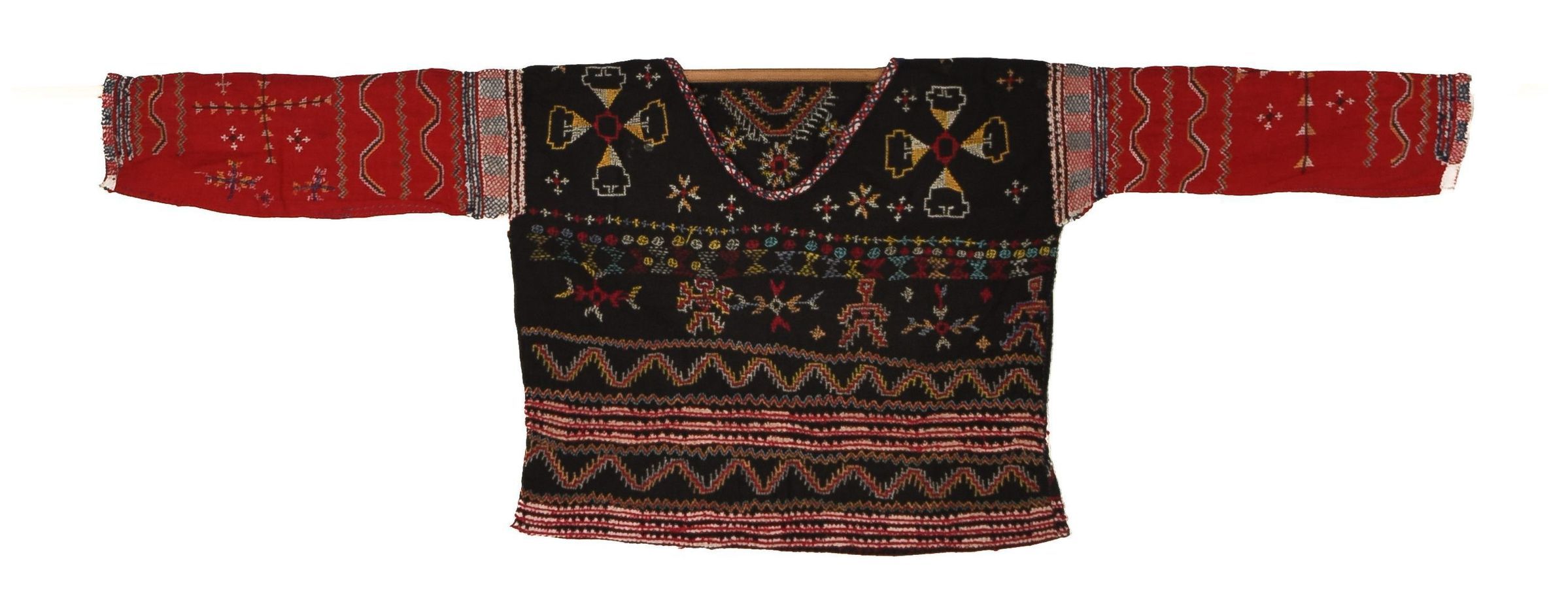 Mindanao woman’s black cotton blouse with red sleeves, additional embroidery and appliqué probably Bilaan with a little Tiboli influence Bilaan due to the human figures.Acquisition