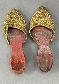 A pair of sandals made with leather soles and green velvet ground with metal thread embroidery. The soles are stamped with number 36, 72, 1914.Acquisition