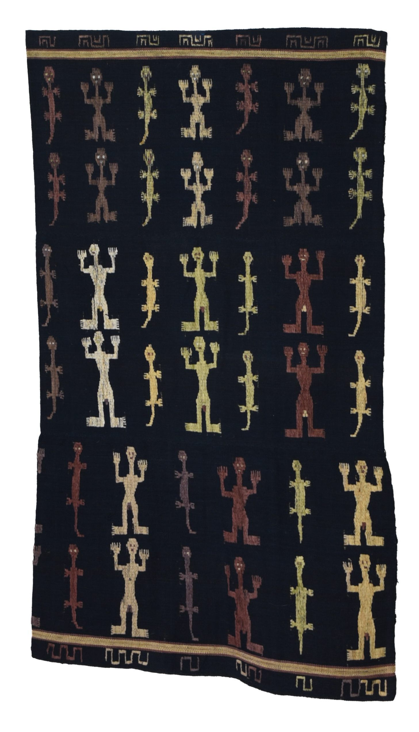 A three-panel cotton tube skirt from Timor, with deep indigo color background and six rows of humans and lizards in supplementary-weft wrapping technique (buna). Similar piece, photo #206, page 312 in “Textiles of Western Timor” Yeager and Jacobson, description page 210. Also attributed specifically to Ayotupas area in “Traditional Indonesian Textiles” by John Gillow, photo 119. The areas are adjacent and the districts have been renamed and divisions changed by the government throughout the years.Acquisition