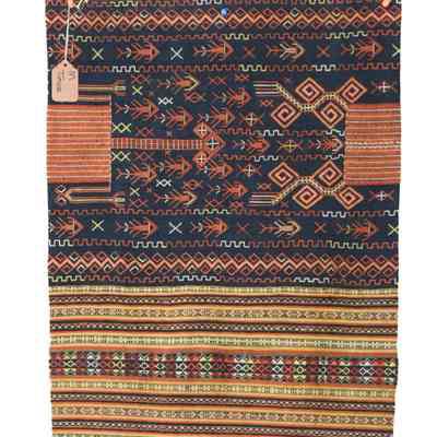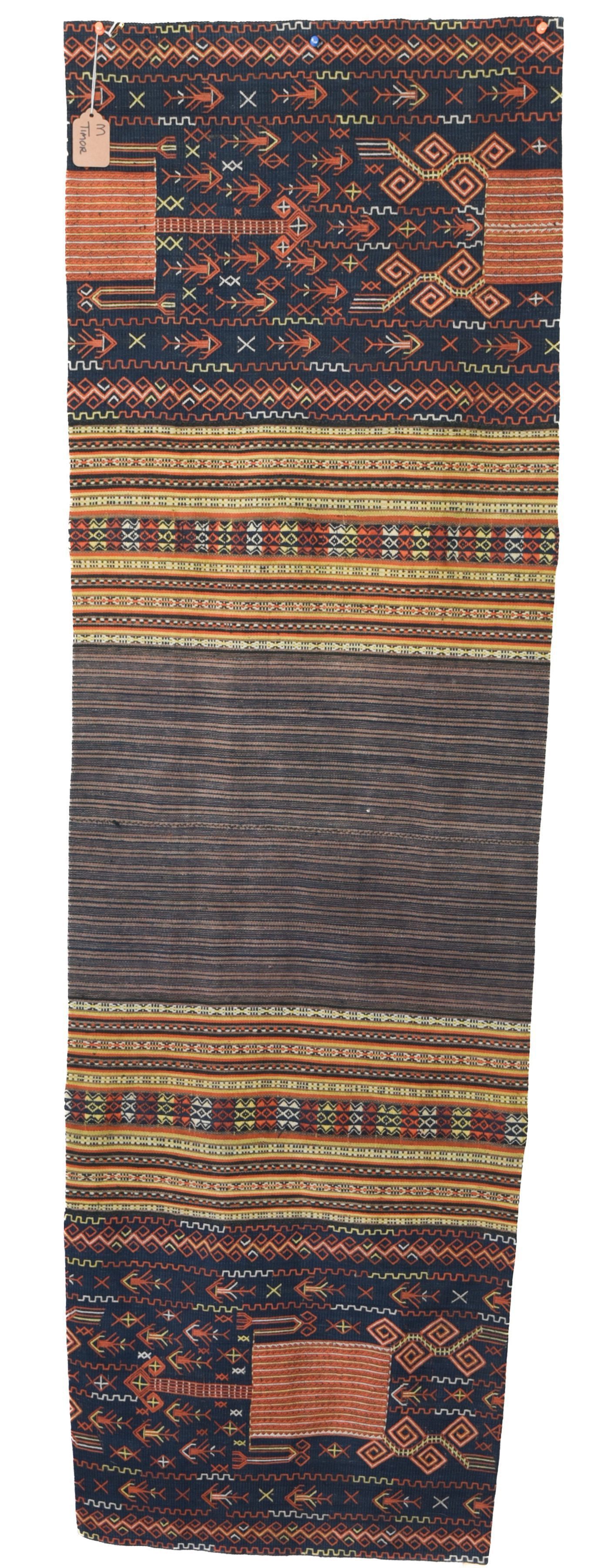 A two-panel tube skirt with reptile and geometric motifs in supplementary weft wrapping technique (buna) and supplementary-warp patterning.Acquisition