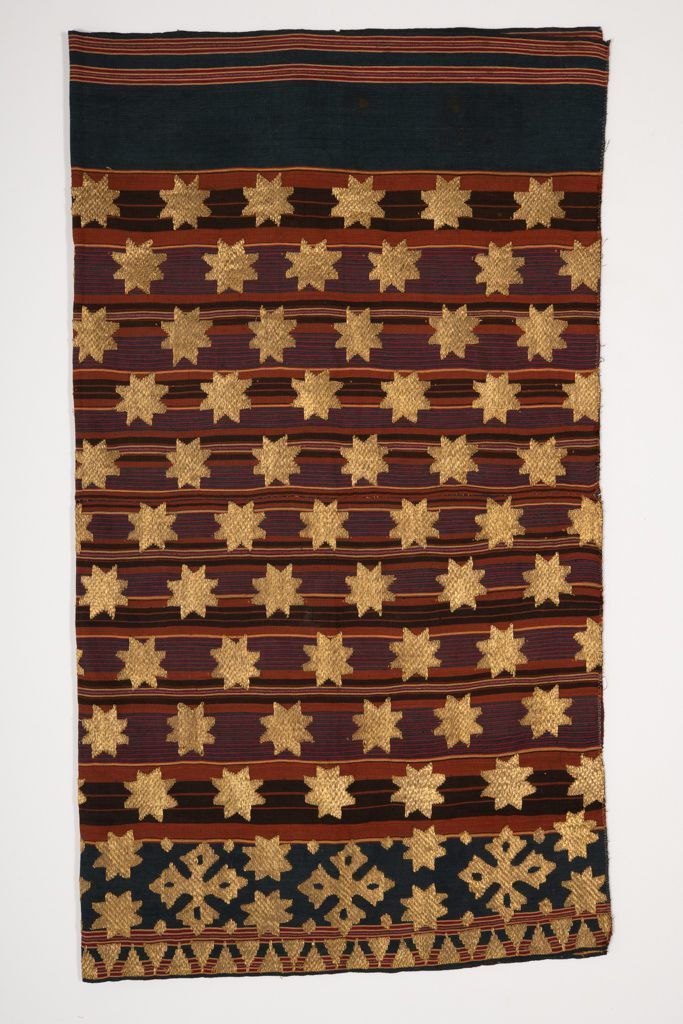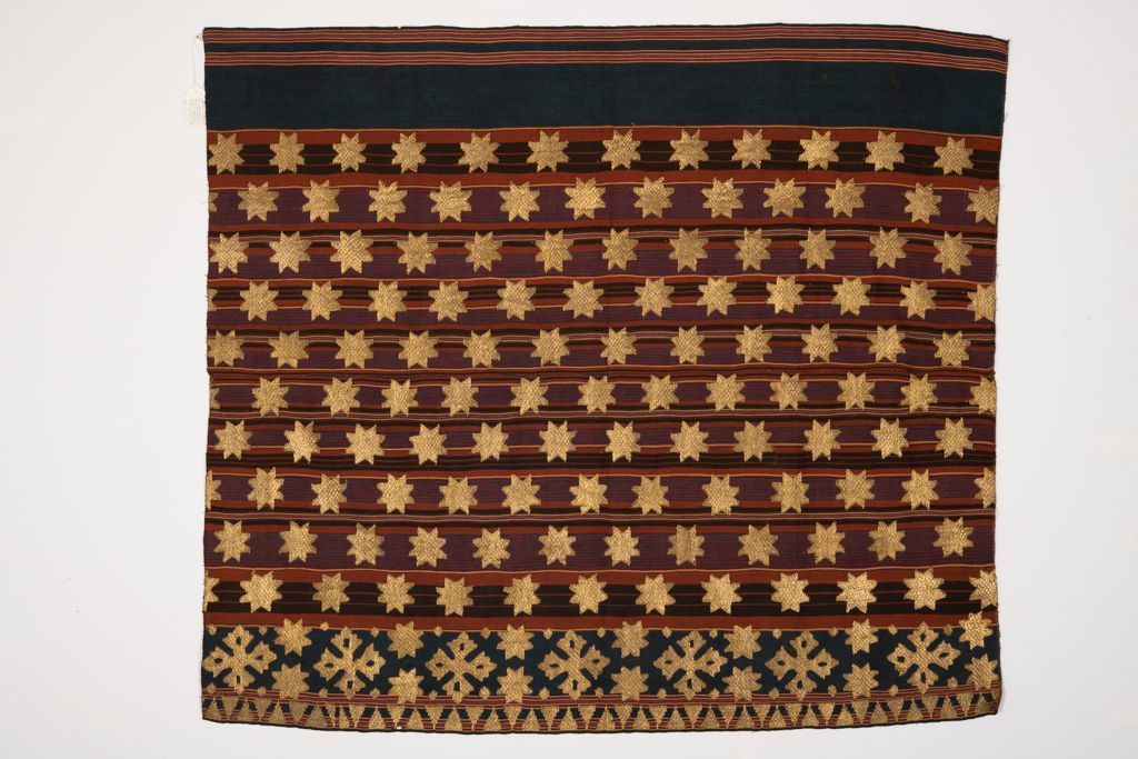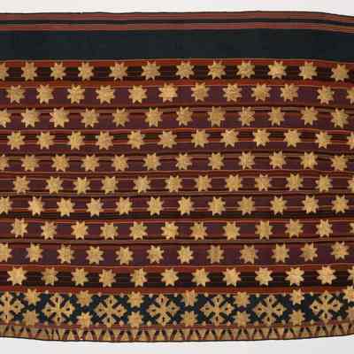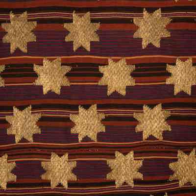 Open Sarong (Skirt) Stars and strips design. Gold thread on mostly purple background.Acquisition