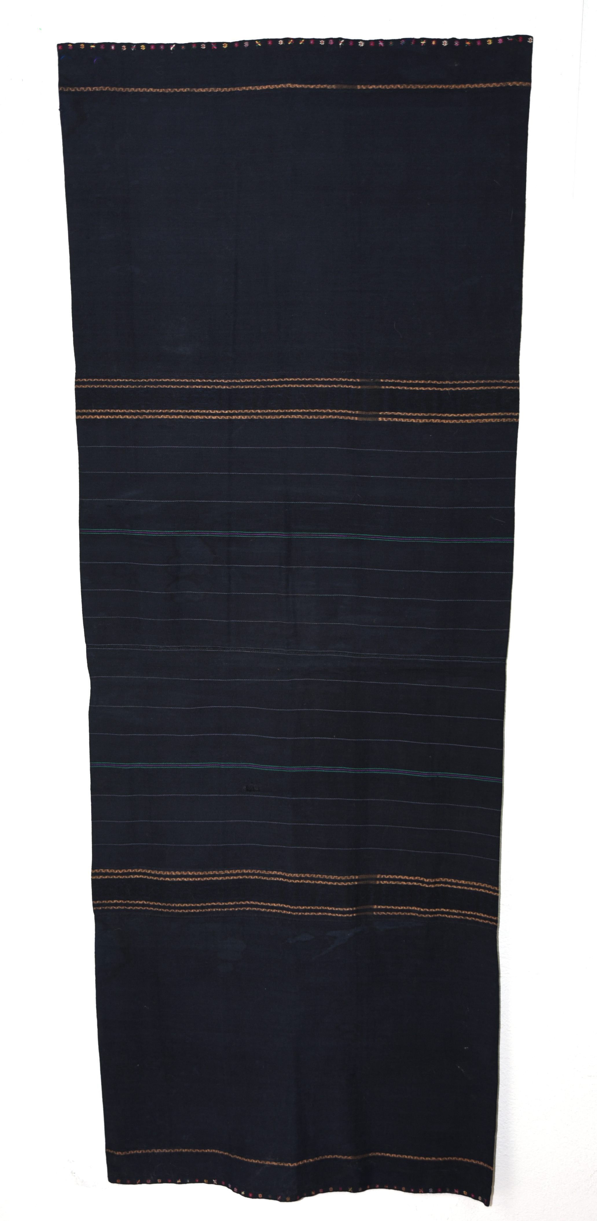 A four-panel cotton tube skirt in dark, with thin blue, green, purple bands and brown-and-beige ikat. Both ends of the skirt are decorated with small flower patterns in supplementary-weft wrapping (buna).Acquisition