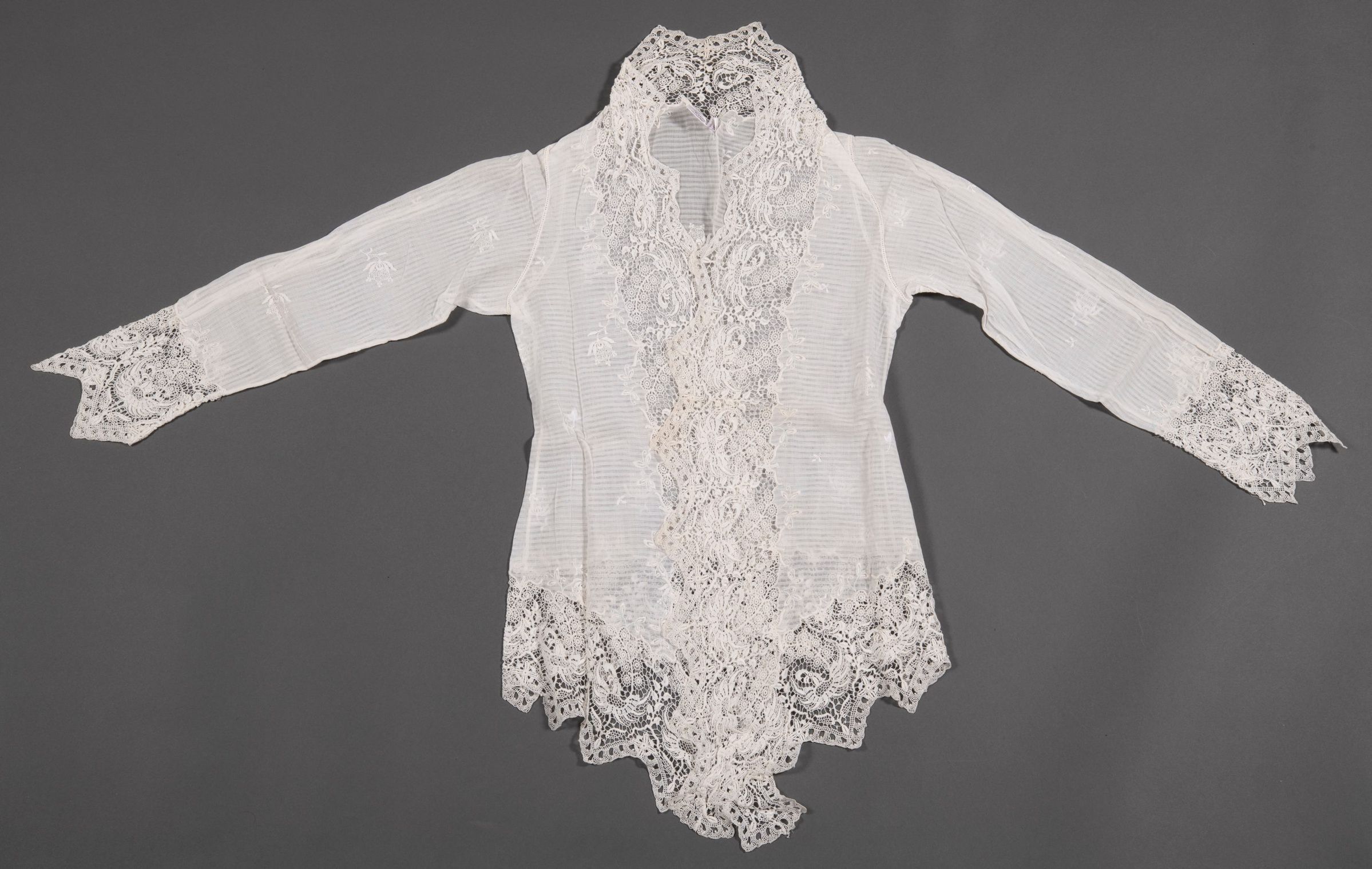 White kebaya made of plain gauze, embellished with white cutwork embroidery lace featuring bird design.Acquisition