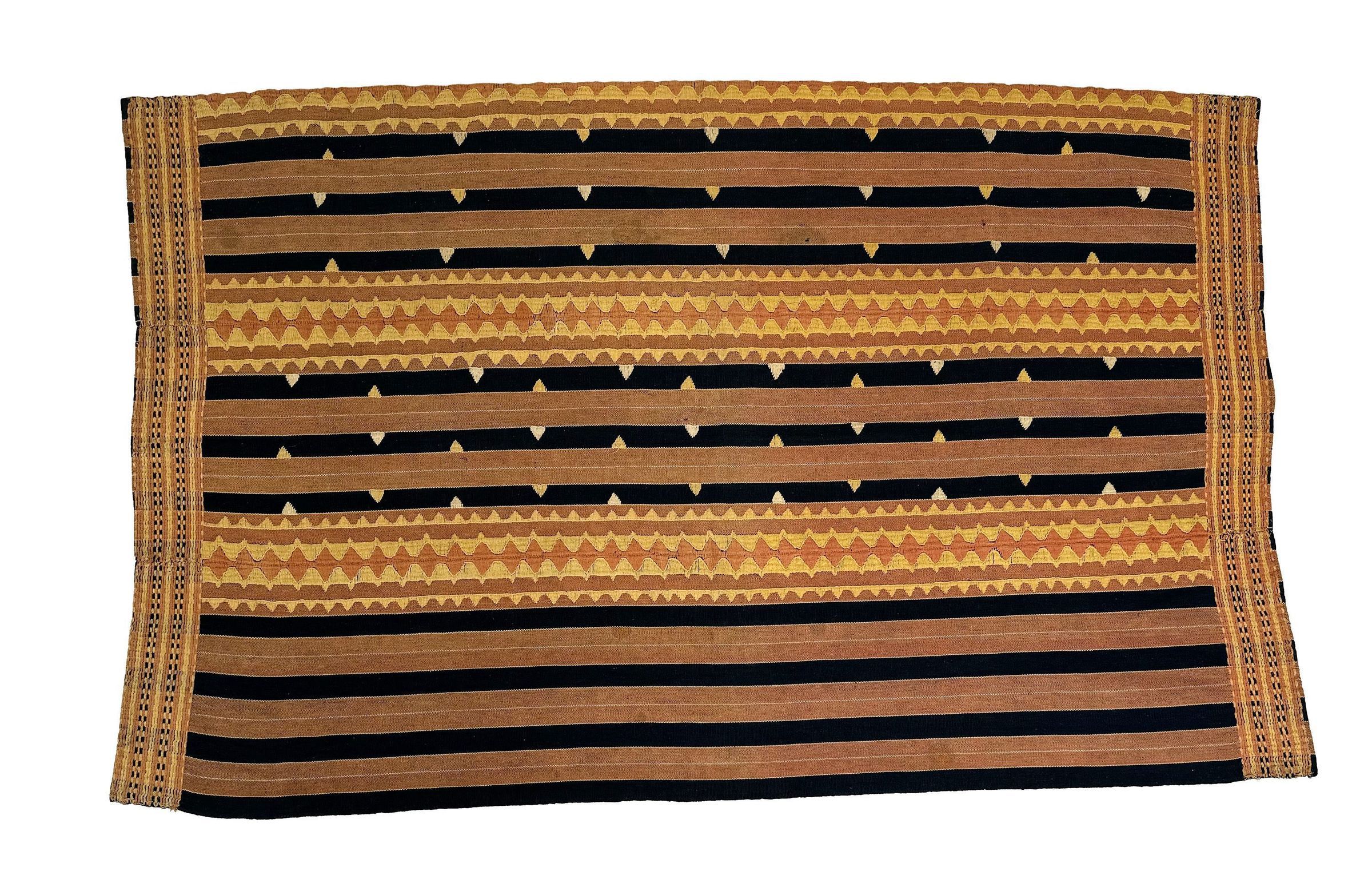 Kalinga woman’s wrap around skirt, cotton in blue, tan, yellow and orange with decorative patterns in supplementary weft. Photo on page 153, “Sinaunang Habi, Philippine Ancestral Weave” Marian Pastor-Roces. Hanging sleeve sewn horizontally.Acquisition