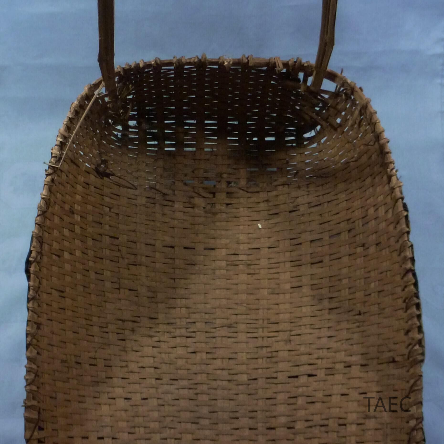 Bamboo basket for doing cording. Covered with batik cloth. Two legs raise the end. In a set with the bamboo sticks. "Deo thang Jeh"Collection
