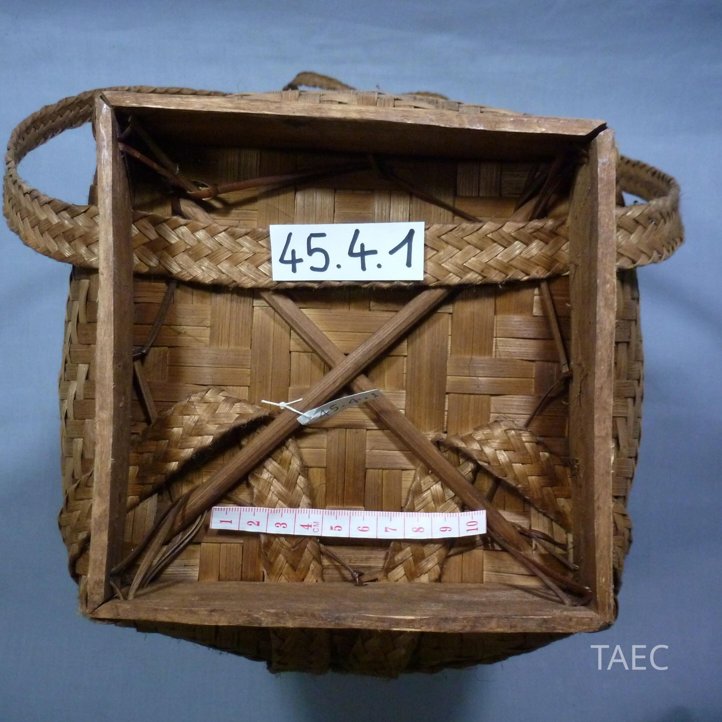 Katu women basket using the Phou Tai basket style. Woven of bamboo (Mai Pai), rattan (Mai Lai), woven by hand. The rim is made of braided rattan, square of four feet made of hard wood, tied connect with rattan. The hard wood is 5.1 cm height and 17.1 cm length. It took one week to make.