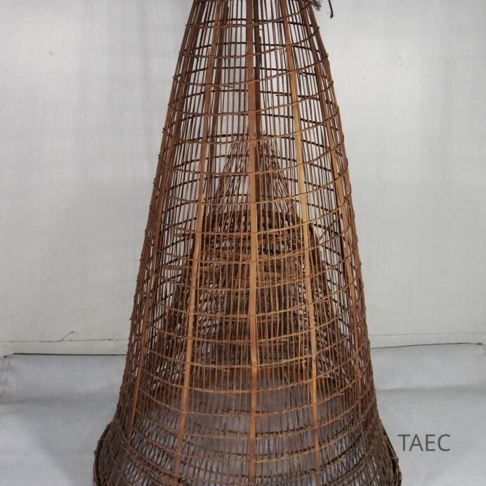 Fish trap made from thin strips of bamboo. Base ireinforced with rattan. Basket has open weave except for the bottom.... or ..... cm, which has a tighter weave. Top of cone is reinforced with second layer of bamboo weaving. Dark brown in colour, made by smoking. Fish are trapped by simply dropping the basket over them in water, not sure how fish are retrieved.Collection
