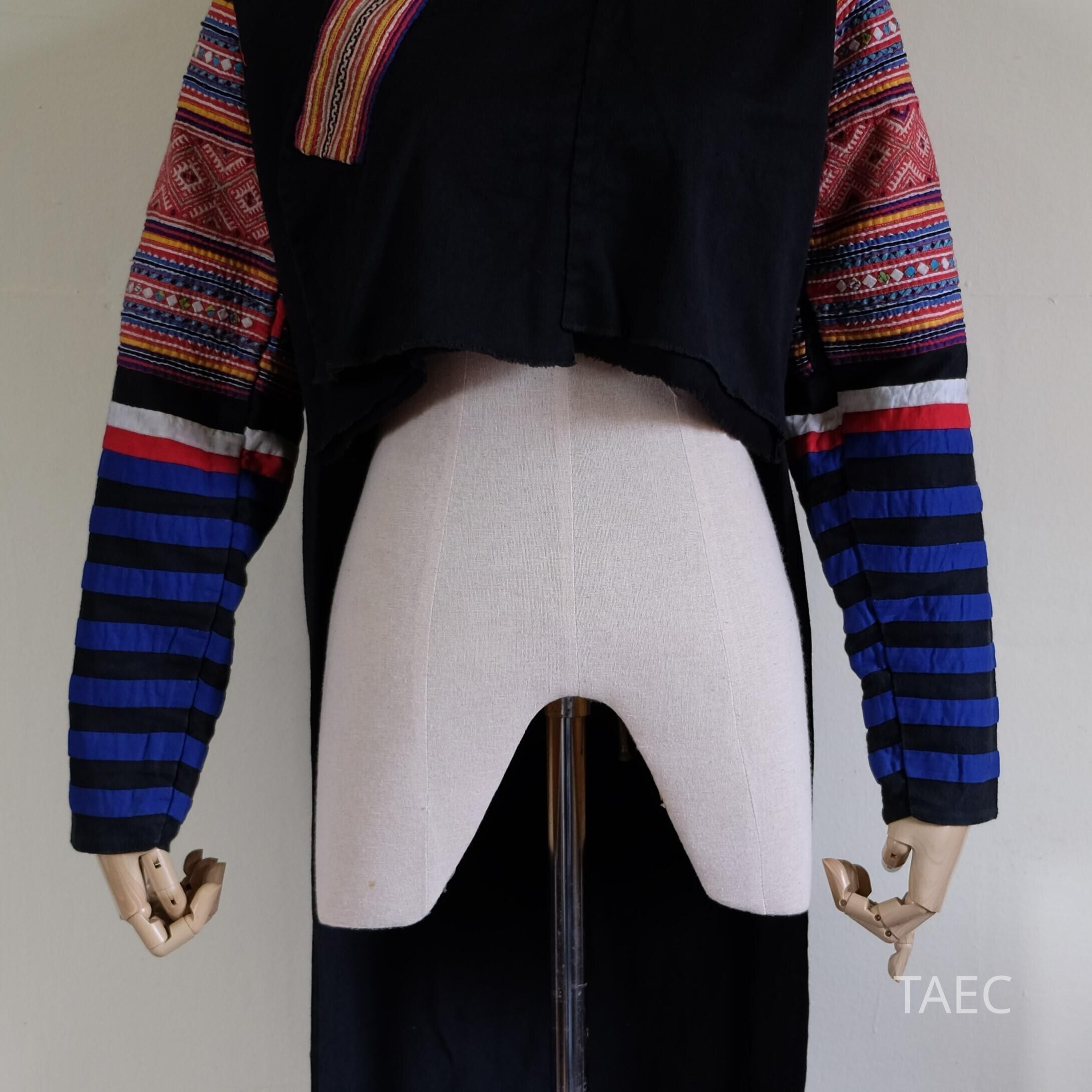 Hmong Du women shirt (Nus). Black and multi-colored fabrics from market, handspun and handwoven white cotton, handwoven silk, indigo dyed, embroidery and applique done by hand. Mrs. Mai Yang made it and used to wear it. Now as she is getting bigger, she cannot wear it, and was in need of money, so she gave it to her daughter (Mrs. Mang) to sell to TAEC. This is everyday wear, but can also be worn on special occasions and during festivals (weddings, new year celebrations, etc.). Girls age 13-years-old and up wear this shirt. It took 2-3 months to finish making, but Mrs. May Yang did not work on it every day—she used her free time away from working and farming in the fields to make this piece.